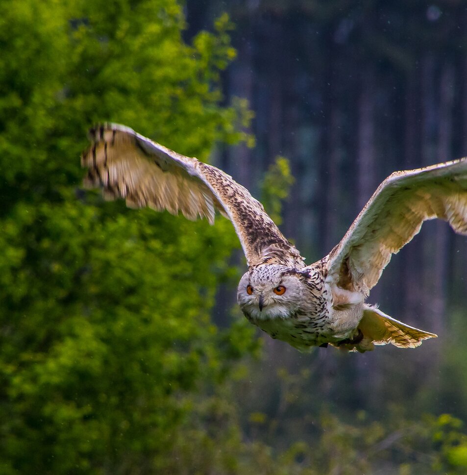 First things first: an eagle owl is an owl, but not every owl has to be an eagle owl! ‘Owl’ is an umbrella term that covers around 200 species such as tawny owls, barn owls and long-eared owls. You can hardly see the eagle owl. On the one hand, because its plumage is a perfect camouflage suit. But it is also because eagle owls usually only travel at night. During the day they sit in trees. Completely motionless. What do they do there? They watch! For example, where the dove has its nest and where the crow retreats to sleep. Then, at dusk and at night, they go hunting. Not only crows and pigeons, but also small songbirds, ducks, hedgehogs, hares, squirrels, even young foxes and fawns are part of its prey.