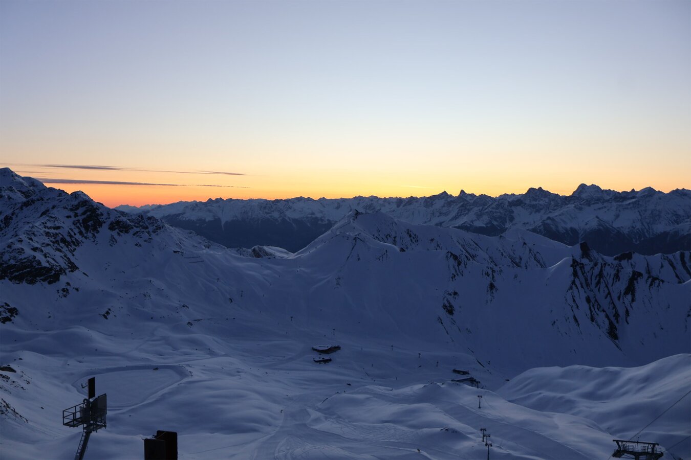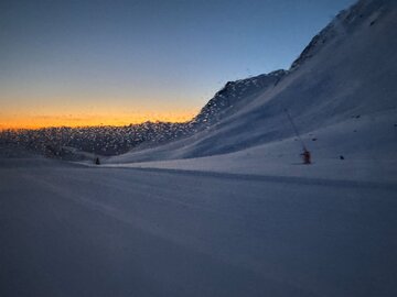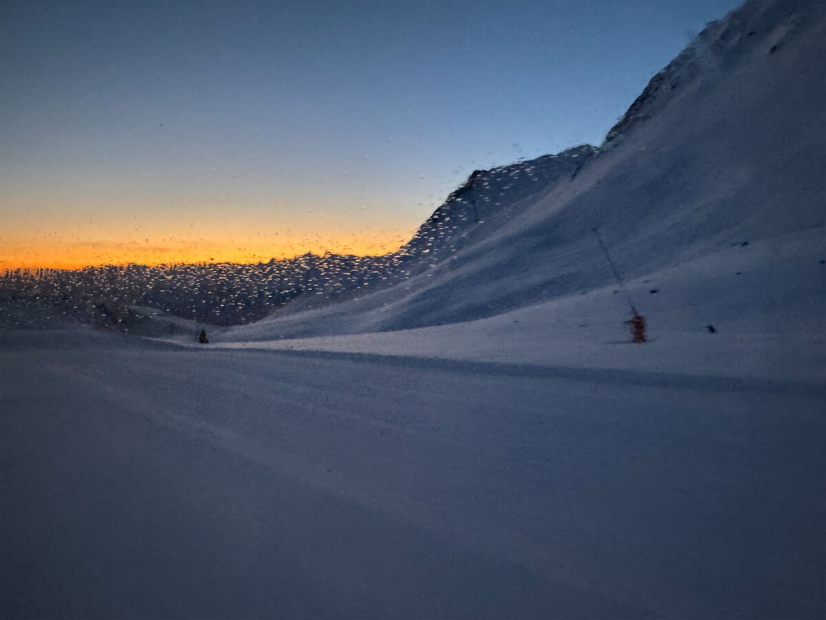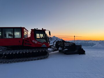 Skier und Snowboards kommen vorne auf die Ladefläche, hinten steigt man in die Pistenraupe ein. Die Fahrt führt über die Mittelabfahrt, vorbei an der Cervosa Alm, hinauf zum Lassida, Richtung Scheid und schließlich ins Masnergebiet – ein kurviger, winterlicher Aufstieg, der bereits für Spannung sorgt. Die Fahrt dauert etwa eine Stunde, und schon nach den ersten Metern beginnt sich der Himmel im Rücken der Pistenraupe langsam aufzuhellen. Hier lassen sich schon die ersten Schnappschüsse machen, während die Dämmerung die verschneite Landschaft in ein sanftes Licht taucht.