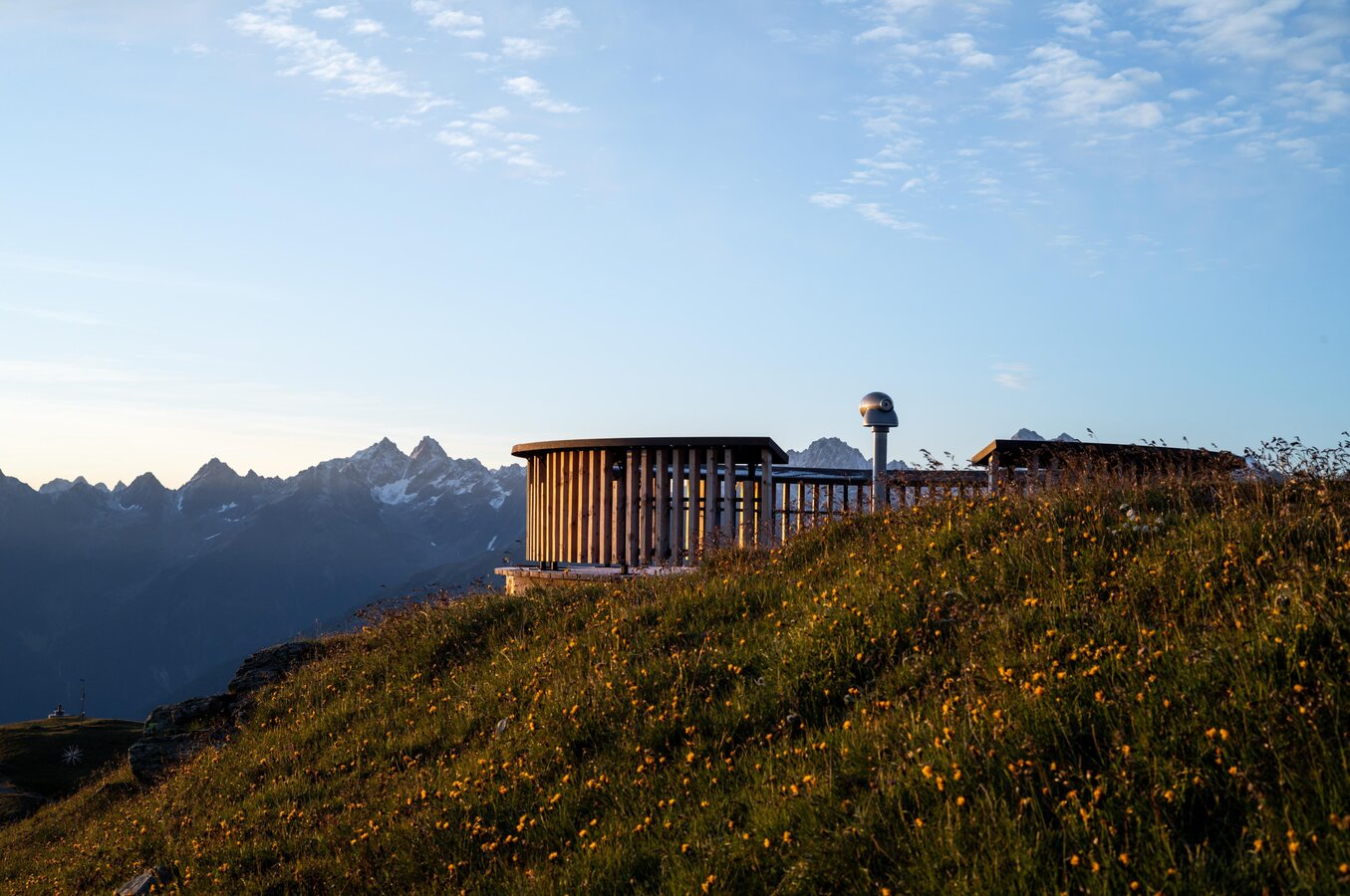 Beim Gipfelkreuz Schönjoch befindet sich der Aussichtsplattform mit herrlichem Rundum-Blick auf die umliegende Berg- und Gipfelwelt.