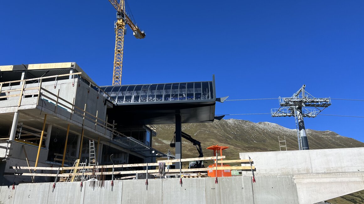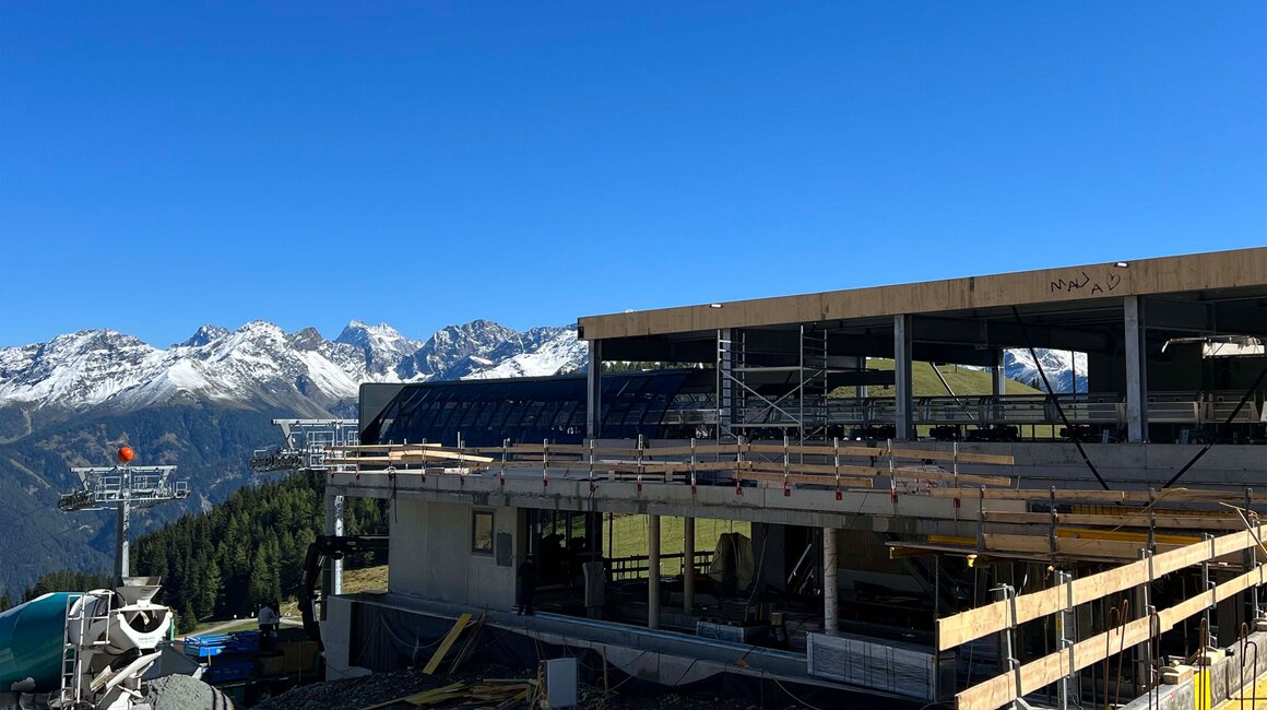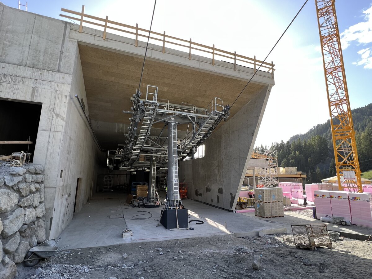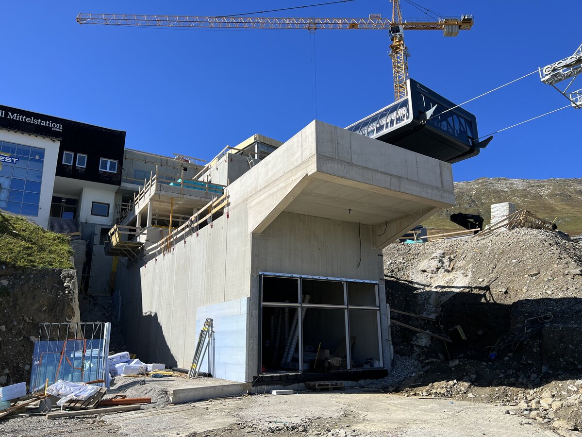 Auch in der Bergstation befinden sich sämtliche Baumeister-Arbeiten in der finalen Phase, es fehlen noch einzelne Stützmauern, Zugangstreppen oder Schneefanggruben im Bahnbereich. Aber auch diese Arbeiten können demnächst abgeschlossen werden. Die Einfahrt des Stationsgebäudes ist bereits verglast, die Dachblenden sind montiert. Auch hier arbeitet die Firma Doppelmayr an diversen Einstellarbeiten. Testfahrten mit den ersten Gondeln konnten erfolgreich durchgeführt werden. Derzeit werden noch sämtliche Installationen (Heizung, Lüftung, Sanitär,...) durchgeführt, sowie der Estrich verlegt. Der Pistenbau ist bis knapp vor dem Gebäude bereits abgeschlossen.