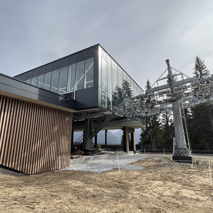 Zeitgleich werden an der Talstation die Verglasungen am Stationsgebäude eingesetzt. Diese sind – im Sinne erneuerbarer Energie - als Photovoltaik-Anlage ausgeführt. An der Fassade wird die Isolierung angebracht, damit der Zimmermann schon demnächst mit der Verkleidung (Holzlamellen) beginnen kann. Letzte Baumeisterarbeiten sind ebenfalls in Gange – wie zum Beispiel die Fertigstellung der Schneefanggruben (in den Zugangsbereichen zur Bahn) oder die Trägerkonstruktion (Bachüberbauung) als Verbindung zum Sunliner.