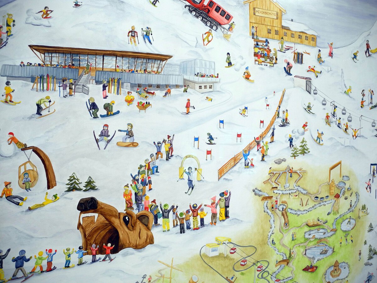 Natürlich kommen auch die jungen Fahrgäste ganz auf ihre Kosten. Ein handgemaltes Wimmelbild spiegelt auf kindliche Weise das Vereinsleben und das allgemeine Dorfleben von Serfaus wider. Durch Ausschnitte auf den beleuchteten Flächen im Tunnel werden die Kids zusätzlich animiert, Ausschnitte im großen Bild zu finden. Eine Holz-Drehfigur sowie vier lebensgroße Lentikularbilder (auch Linsenrasterbild oder ganz einfach Wackelbild genannt) sorgen für zusätzlichen Spaß in der Station Zentrum. Aber Achtung: Nicht dass man vor lauter Ablenkung die Bahn versäumt…