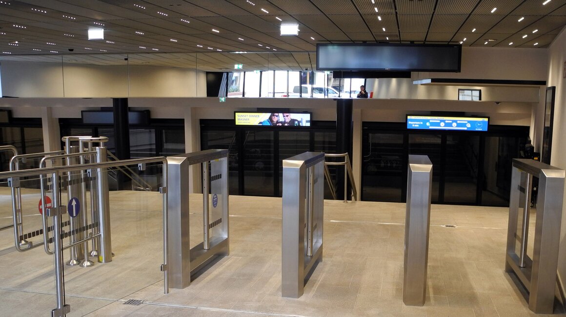 Der neue Zugang erfolgt mehr oder weniger ebenerdig. In der Station selbst ist der geringe Höhenunterschied entweder über eine Treppe oder über eine leicht abfallende Rampe überwindbar. Zusätzlich ist ein Treppenlift installiert, der ganz einfach zu bedienen ist. Die große Glasfront, in der die Schiebetüren integriert sind, sorgt für eine optimale Nutzung des Tageslichts. Ein zusätzlicher Lichtschacht bringt noch mehr Helligkeit in die Station.