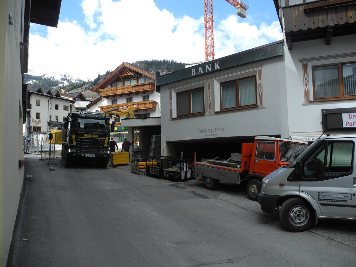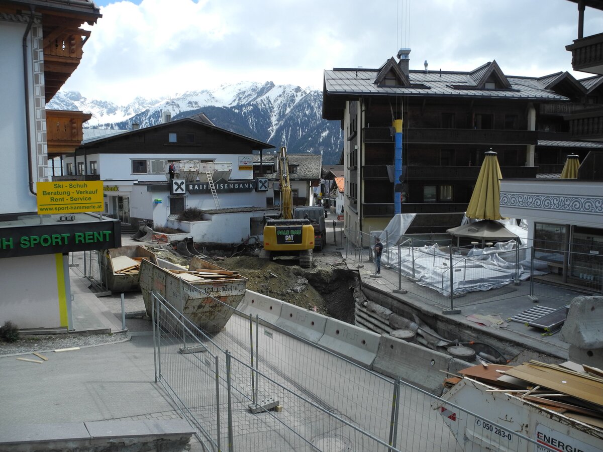 Der Betrieb der U-Bahn Serfaus wurde bereits am Abend des 13. April 2018 eingestellt. Am Wochenende konnten so bereits erste Vorbereitungsmaßnahmen getätigt werden, ehe dann am ersten Tag der Zwischensaison die Baustelle im Dorfzentrum von Serfaus eingerichtet werden konnte. Ein weit sichtbarer Kran deutet bereits darauf hin, dass hier eine größere Baustelle ansteht.