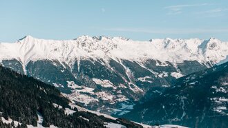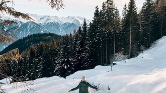 Unsere Wahl fällt auf den beliebten Panorama-Genussweg. Panorama & Genuss – das klingt doch wie für uns gemacht. Los geht’s an der BERGSTATION der Möseralmbahn. Von dort verläuft der Winterwanderweg auf aussichtsreichen 1.800 Metern Seehöhe ungefähr fünf Kilometer lang bis zur MITTELSTATION der Komperdellbahn. Alternativ kann man selbstverständlich auch in die entgegengesetzte Richtung marschieren. Der Weg ist bestens beschildert und beeindruckt mit einem fantastischen Panorama.