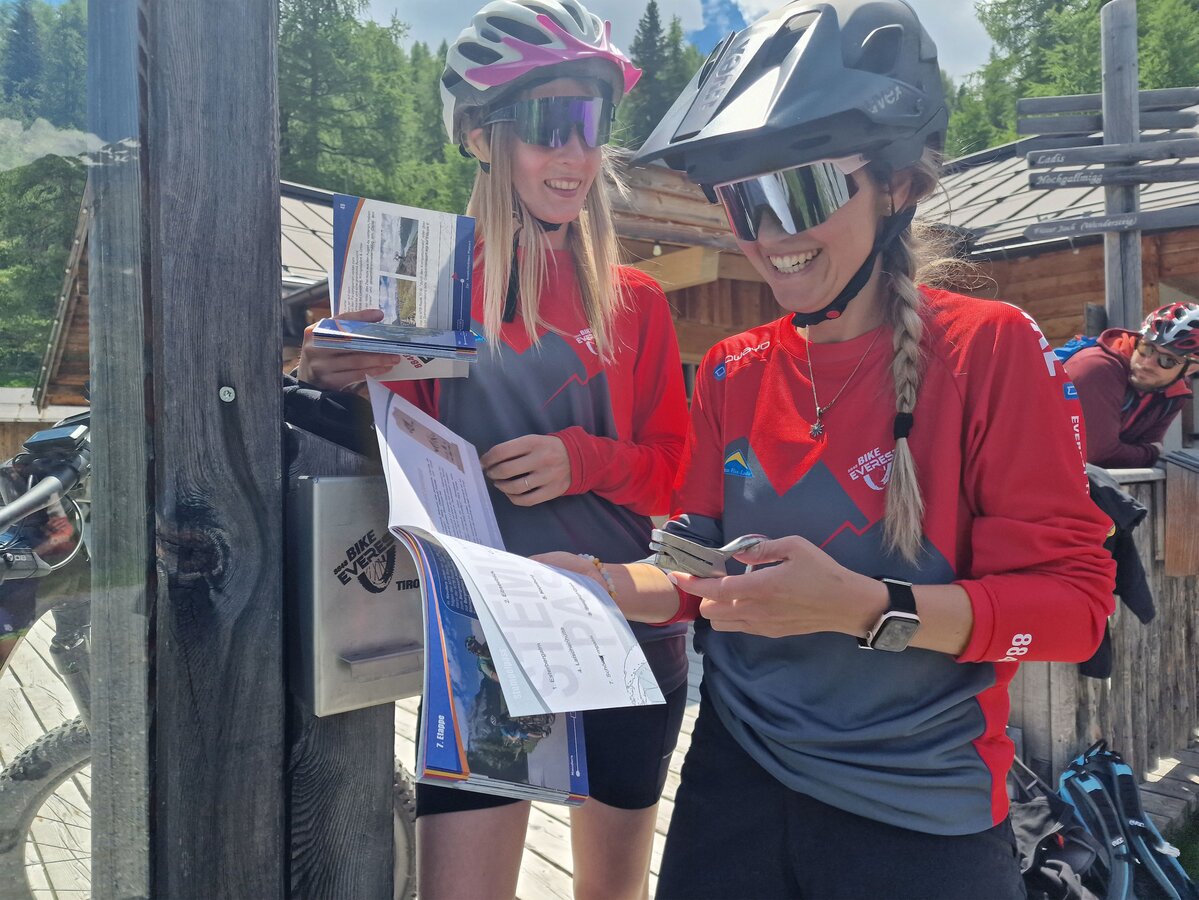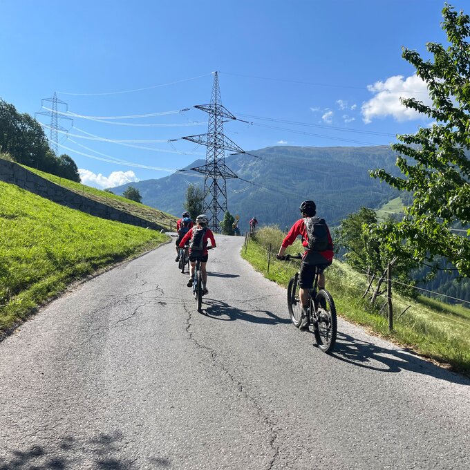 Entlang der historischen Via Claudia Augusta führte unsere Route mit dem ersten Anstieg über die wunderschöne Fließer Platte. Hier konnten wir noch die Spuren der alten Römer erkennen, die sich in den Radwegen verewigt hatten. Der Ausblick auf die umliegenden Dörfer war einfach eindrucksvoll. Vom breiten Radweg über schmalere Trails erreichten wir schließlich das verwinkelte Dorf am Sonnenhang: Fließ. Dort suchten wir den Gasthof Traube auf, um unseren allerersten Stempel fürs Bike-Everest-Heft zu erhalten. Nach einer kurzen Kaffeepause setzten wir unsere Tour fort. Nun ging es erst Mal bergab im strahlenden Sonnenschein.