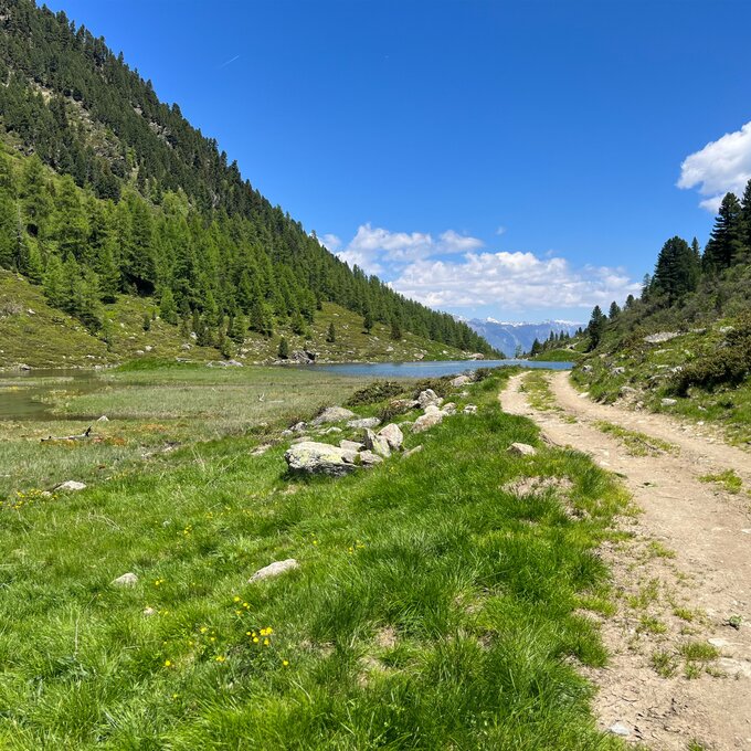 Bei der Abzweigung zur Schöngampalm entschieden wir uns spontan, einen kurzen Abstecher in das wunderschöne Urgtal zu machen. Ein herrlicher Bergsee mit tiefblauem Wasser erwartete uns dort und lud uns zu einer wohltuenden Pause ein, um unsere Energiereserven wieder aufzuladen. Das klare Wasser schimmerte verlockend in der Sonne, umgeben von majestätischen Gipfeln. Wir ließen uns auf einer Grasfläche nieder und genossen diesen Anblick für einen kurzen Moment.