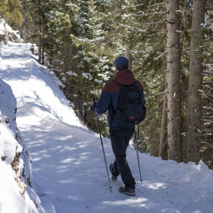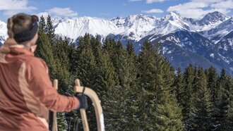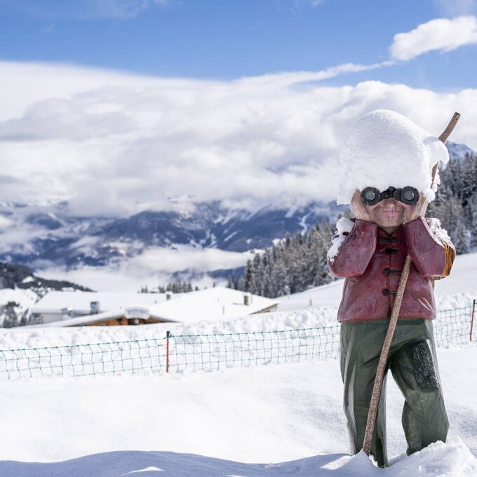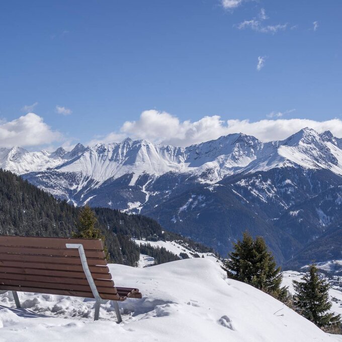 Von der Bergstation Komperdell wandern wir nach dem Mittagessen auf dem markierten Panorama-Genussweg und genießen die traumhaft schönen Aussichten. Der Weg ist angenehm breit und gut ausgebaut, nur an wenigen Stellen müssen wir die Ski- und Snowboardpisten überqueren. Zu Beginn verläuft die Wanderung noch flach über die Serfauser Jochwiesen bis zum Königsleithewald und vorbei an der Bergstation Sunliner. Dort sind wir noch im Sommer mit der Zipline „Serfauser Sauser“ in vier Etappen durch die Tiroler Bergwelt gesaust. Das war vielleicht ein Abenteuer!