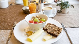 Der Wecker klingelt, die ersten Sonnenstrahlen fallen durch das Fenster direkt auf das gemütliche Hotelbett, in welches wir uns noch ein letztes Mal richtig einkuscheln. Ein ferner Blick durchs Fenster lässt bereits einen grandiosen Tag im Schnee erahnen. Zusammen mit der Vorfreude auf das leckere Frühstück hüpfen wir aus dem Bett. Beim Frühstücksbuffet angekommen, schlemmen wir uns durch all die leckeren, regionalen Köstlichkeiten und genießen eine Tasse Kaffee mit Blick auf die Piste. Hach, einfach herrlich!