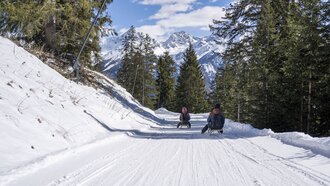 Nun gehts aber auf die Rodel. Direkt neben der Mittelstation der Schönjochbahn beginnt die Hexen-Rodelbahn, welche durch einen überdimensionalen Schlitten und einen Hexenbesen markiert ist. Auf dem breiten Weg führt uns die Rodelbahn bis zur Talstation der Schönjochbahn in Fiss. Doch auch hier müssen wir das eine oder andere Mal Halt machen, denn die Aussichten über die Tiroler Bergwelt sind einfach zu schön, um einfach nur daran vorbei zu sausen. Die Rodelbahn verfügt über ziemlich coole Kurven, Kehren und schnellen Geraden. Nach vier Kilometern Rodelspaß erreichen wir Fiss. Das hat echt Spaß gemacht!