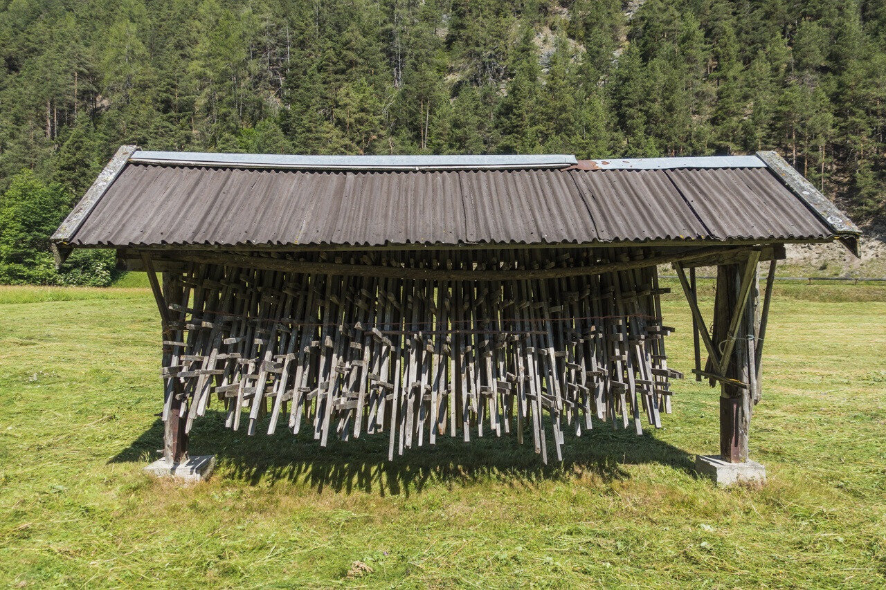Im Tal wurde das Heu früher auf großen Wägen von Lasttieren abtransportiert. Heute verwenden die Bauern meist Pressen, die vom Traktor gezogen werden und das Heu zu Ballen formen.