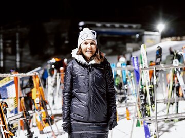 Der kreative Kopf hinter dem Nightflow ist Eva Stark, die Leiterin des Kinder- und Anfängerbereichs der Skischule Fiss-Ladis. Sie war lange Zeit selbst im Demo-Team und hat von Beginn an bei der Entwicklung der Show mitgearbeitet. „Irgendwann habe ich die Leitung dann übernommen“, sagt sie. Für jede Show werden von Eva und dem Kreativteam – zu dem auch Daniel Frizzi gehört – unzählige Stunden Arbeit investiert. „Der Nightflow ist von der Planung her sehr umfangreich und es dauert lange, die Idee in ein fertiges Regiebuch zu verwandeln. Viele Leute sind gleichzeitig am Hang, die müssen koordiniert werden, dazu muss die Musik abgestimmt werden, die Drohnen passend fliegen, das Feuerwerk zeitlich perfekt ausgelöst werden“, erzählt sie. Eva ist bei jeder Show selbst vor Ort und gibt die Kommandos. „Mir macht das riesigen Spaß“, sagt sie – und ist schon wieder weg, es gibt viel zu tun an diesem Abend.