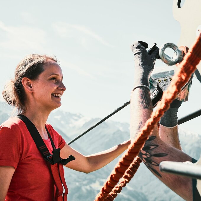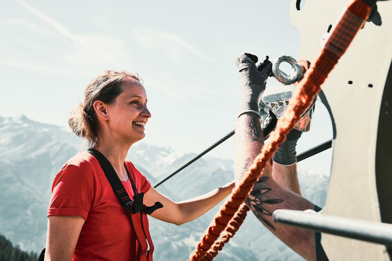 "Safety first" heißt es natürlich auch hier. Mir wird alles in Ruhe erklärt und ich werde ordnungsgemäß mit einer Pilotenweste bestückt. Die Gaudi verläuft über vier Flugstrecken, insgesamt rausche ich über eine Strecke von 2.000 m talwärts. Da sollte dann also genug Zeit bleiben, den Ausblick und den Flug zu genießen, oder? Nun geht’s rauf auf die Waage. Die Rolle wird nämlich je nach Körpergewicht ausgewählt. Falsch machen kann man beim Sausen nichts – gebremst wird nämlich automatisch. Auch die Guides auf den vier Plattformen sorgen auf der kompletten Strecke für optimale Sicherheit.