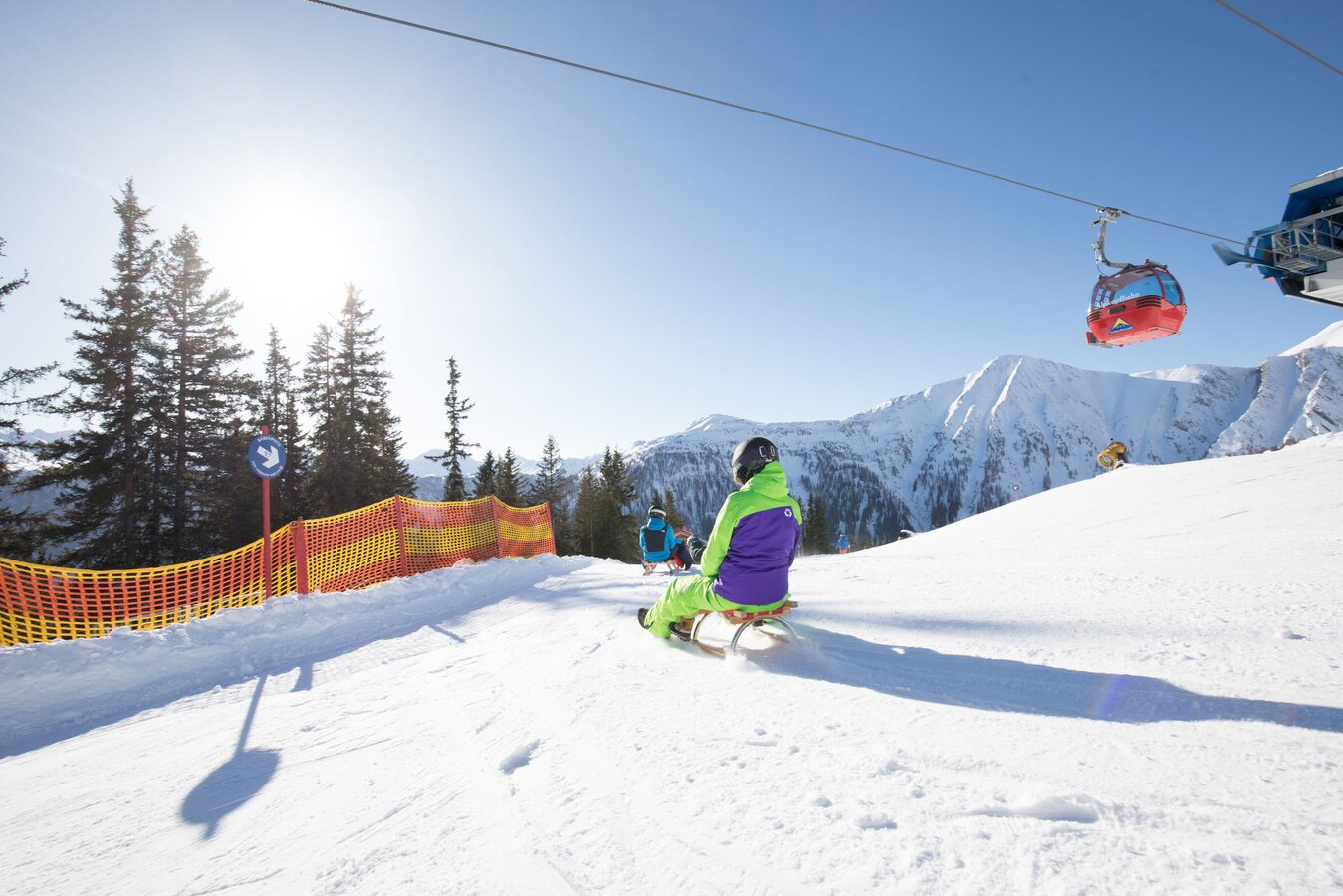 Rodeln mit Kinderlehne gibt es in den Sportgeschäften in Serfaus-Fiss-Ladis natürlich auch zu leihen.
