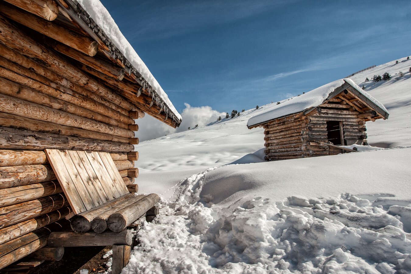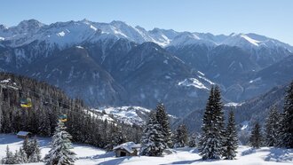 Im Winter sind die HOLZHÜTTEN von einer weißen Schneepracht bedeckt. Während du sitzend mit der Schöngampbahn gipfelwärts fährst, kannst du in der Ferne auf ihre Dächer blicken. Kannst du sie sehen?