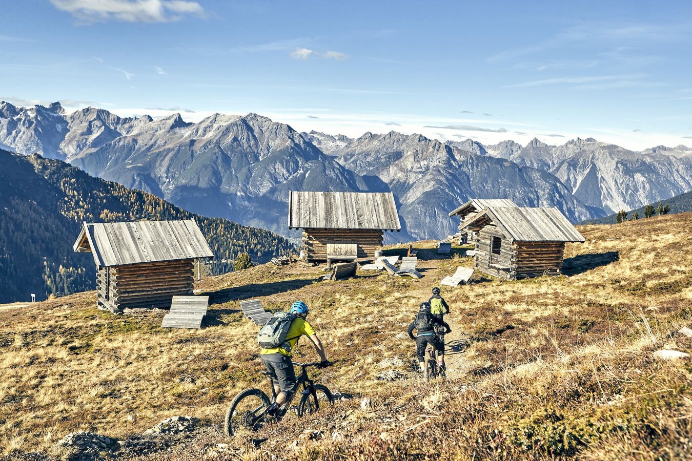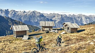 Sind dir die rustikalen Hütten mit ihren dicken runden Hölzern auf der Fisser Nordseite schon mal aufgefallen? Im Sommer führt der Zirbentrail an ihnen vorbei. Sie laden ein, den Puls der Biker für einen kurzen Augenblick zu mäßigen und das Glück, sich in der Natur bewegen zu dürfen, zu begreifen. Die Aussicht hier oben ist nämlich ganz schön grandios.