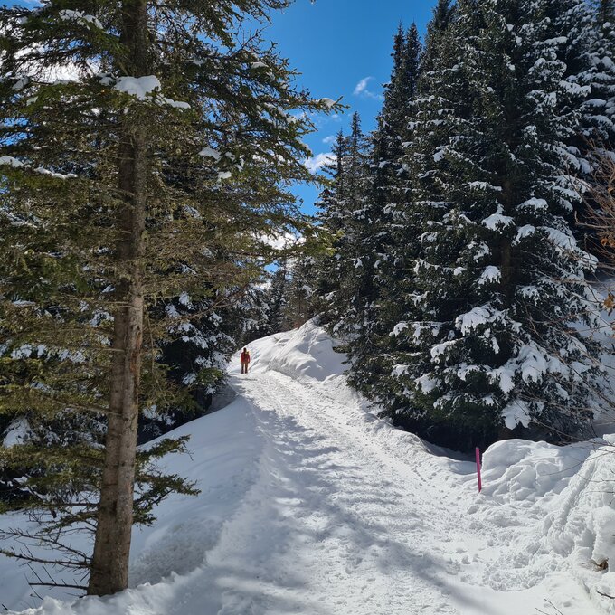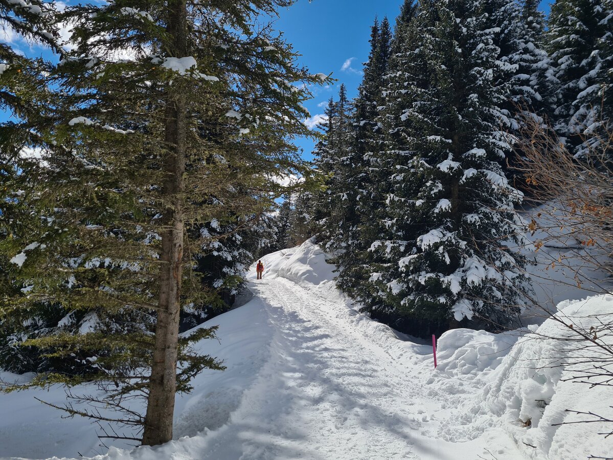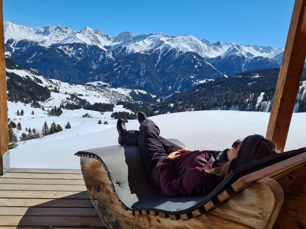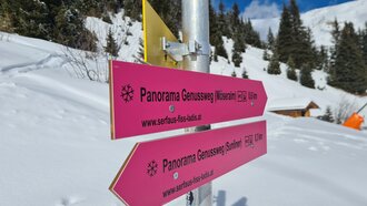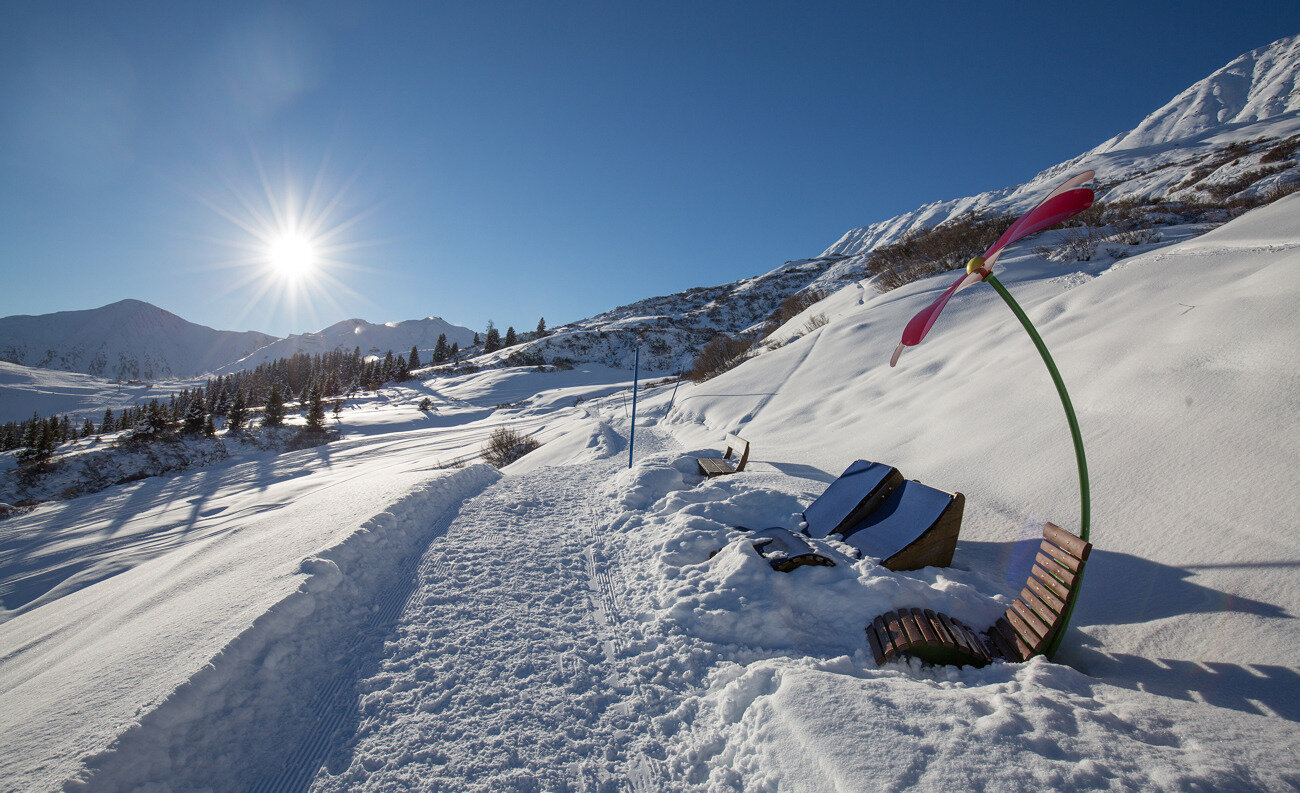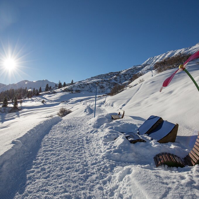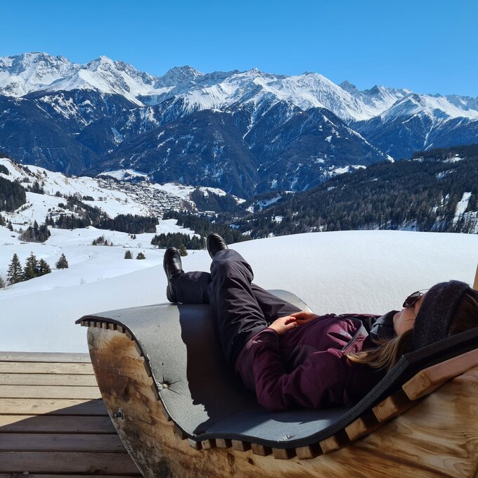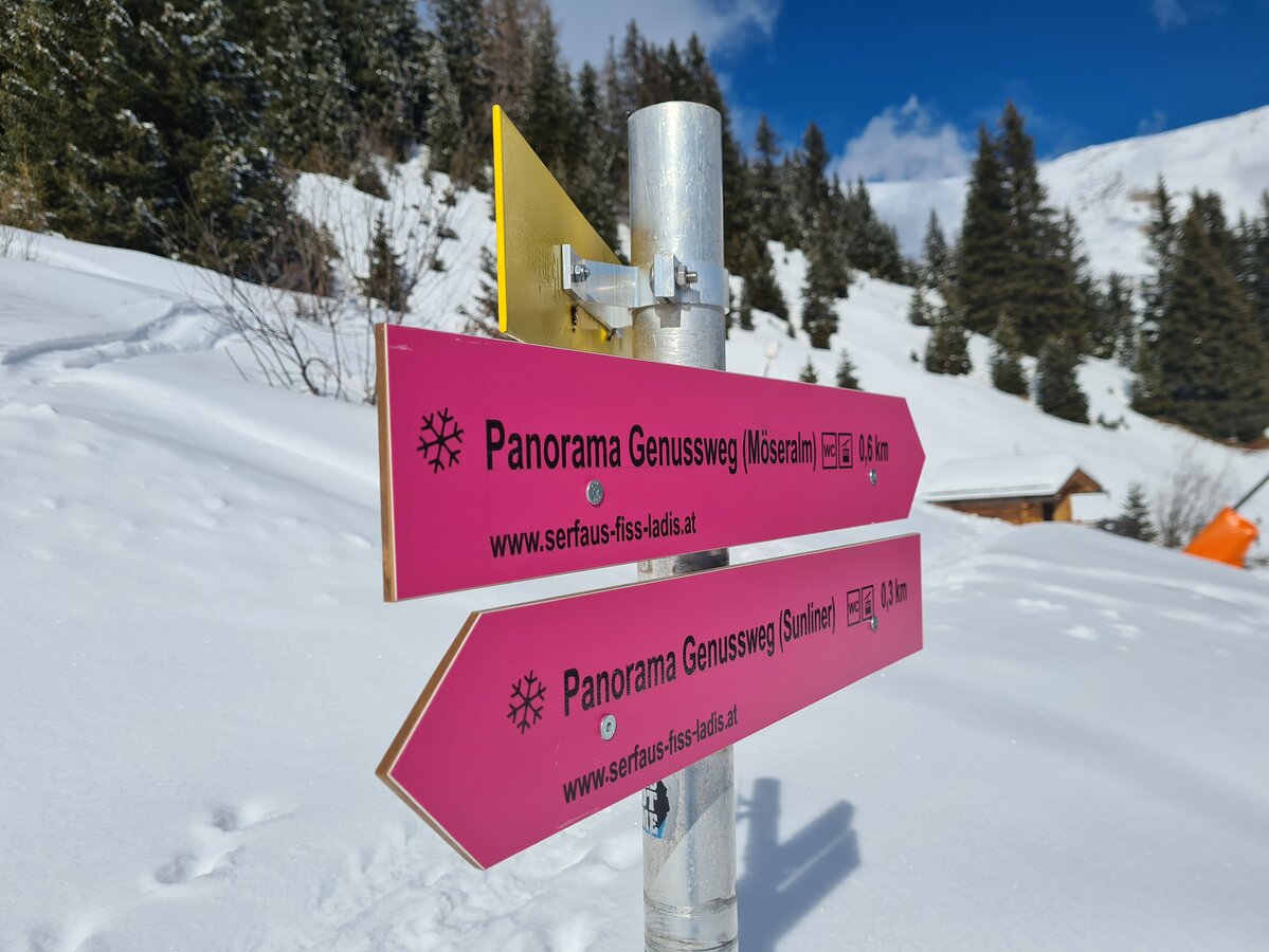 Vorbei an der Bergstation des Sunliners gelangt man in ein weiteres beschauliches Waldstück. Hier wird die Umgebung von einer angenehmen Ruhe erfüllt, die nur vom leisen Knirschen des Schnees unter den Schuhen begleitet wird. Nachdem man diesen Abschnitt hinter sich gelassen hat, offenbart sich der Panorama-Genussweg in seiner vollen Pracht. Eine beeindruckende Aussicht auf das Skigebiet und das Dorf Serfaus lädt dazu ein, an den verschiedenen Rast- und Genussstationen innezuhalten. Die Zeitangabe von etwa 1,5 Stunden Gehzeit ist gut kalkuliert, ermöglicht jedoch genügend Freiraum für Pausen und das Genießen der winterlichen Umgebung. Ein besonderes Highlight ist die überdachte Genussstation mit Relax-Liegen, wo man die herrliche Bergwelt sogar mit musikalischer Untermalung genießen kann.