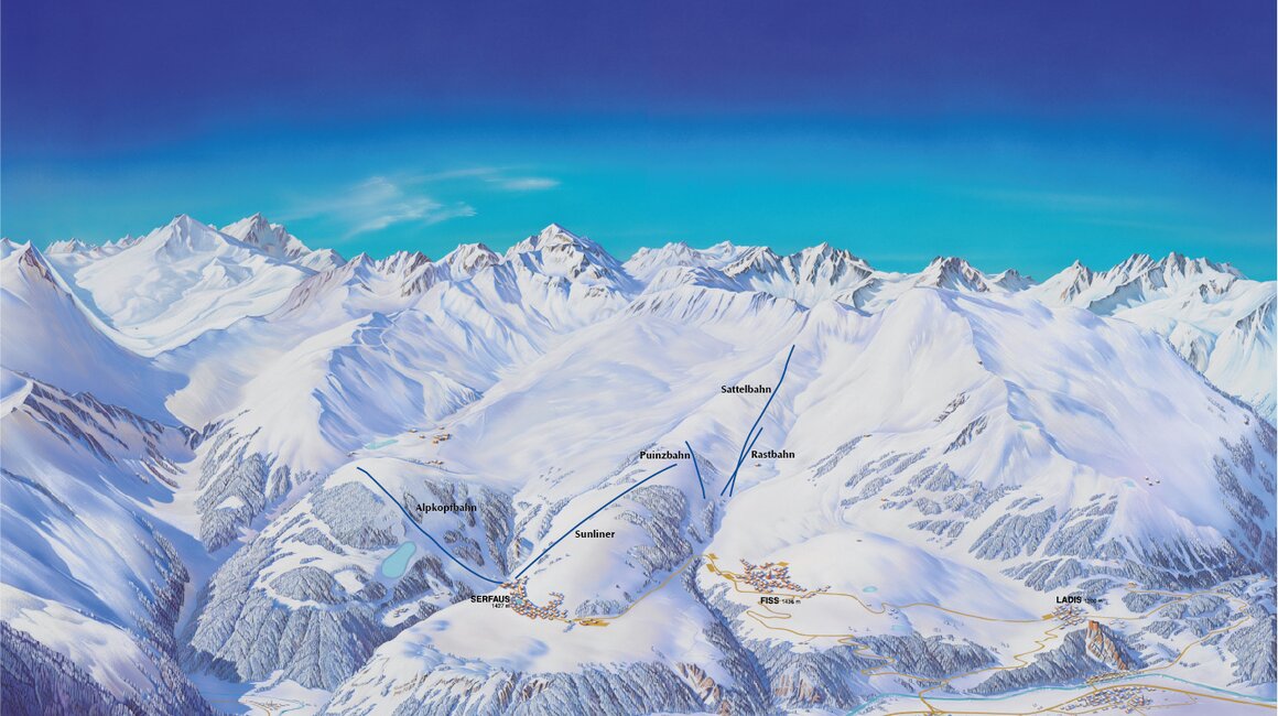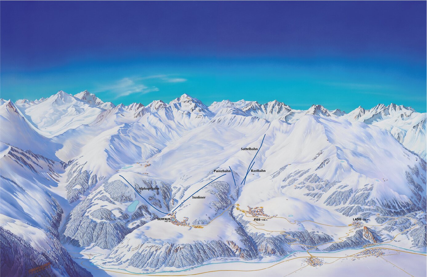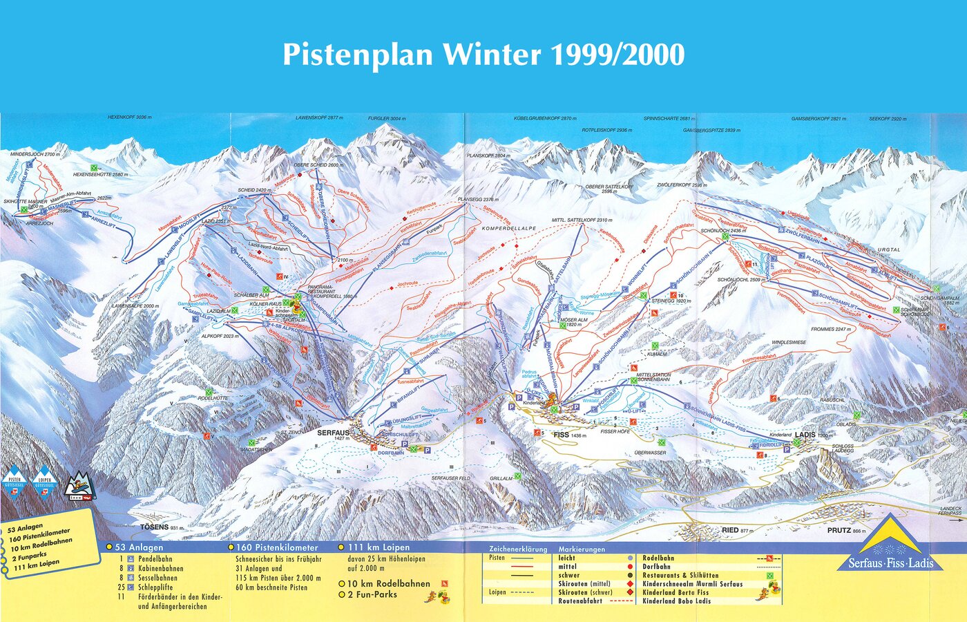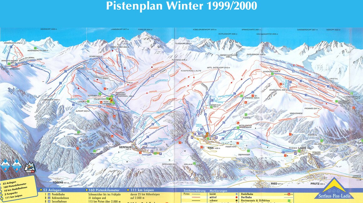 Der erste Pistenplan der Region Serfaus-Fiss-Ladis von 1999/2000 hat Symbolkraft. Die neue Skiwelt bot bereits 53 Anlagen, mit denen 60.000 Personen pro Stunde befördert werden konnten. 160 PISTENKILOMETER standen Gästen und Einheimischen durch den Zusammenschluss zur Verfügung, wovon bereits 60 Kilometer beschneit werden konnten.