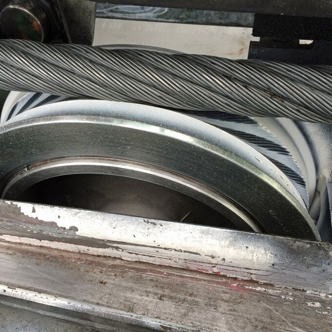 Elmar erklärte mir, dass die Station immer auf die Seilachse ausgerichtet werden muss. Dazu besprühte er die Rollen mit weißer Farbe, um zu sehen, wo das Seil die Rollen genau berührt. Hier geht es um Millimeterarbeit. Insgesamt wurde die Station um 34 Millimeter verschoben. Dabei mussten 40 bis 60 Tonnen bewegt werden.