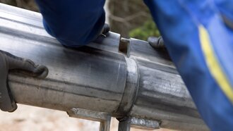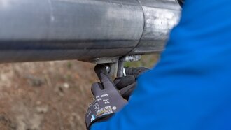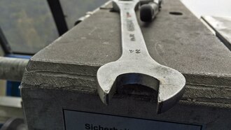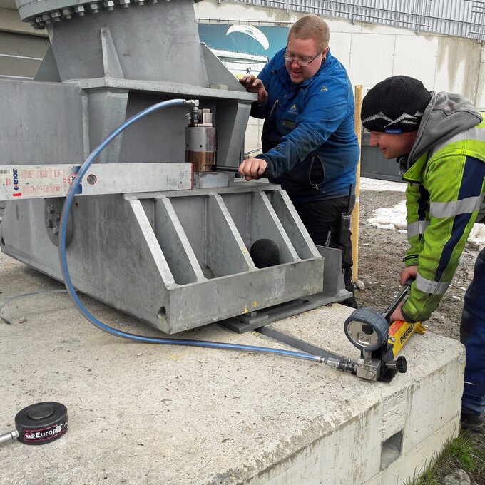 Diverse Hilfsmittel kommen zum Einsatz, um die Tonnen in Bewegung zu versetzen. Auf das überstehende Gewinde wird ein sogenannter Überspannzylinder aufgedreht. Der hydraulische Druck wird anschließend von einer Hydraulikpumpe aufgebracht.