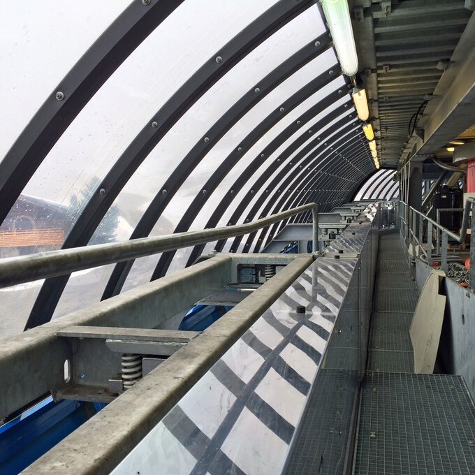 Beim Einfahren in die Station wird die Klemme der Gondel vom Seil gelöst. Fährt die Gondel wieder hinaus, wird die Klemme automatisch wieder geschlossen und umgreift das Seil. Sollte aus irgendeinem Grund die Klemme nicht richtig am Seil sitzen, so wird die Bahn sofort gestoppt. Eine Blende überprüft die richtige Lage der Klemme. Ganz schön ausgeklügelt.