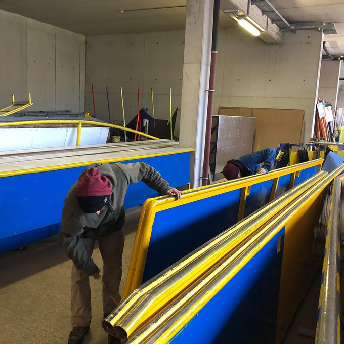 Zu den zahlreichen Aufgaben, die erledigt werden müssen, gehören auch die Vorbereitungen der Fun Areas. Die zahlreichen Rails, Boxen und Walls werden natürlich gleich nach der Wintersaison in die Halle gebracht, um in der hauseigenen Schlosserei wieder auf Vordermann geschweißt und gestrichen zu werden. Somit können wir im nächsten Winter wieder genüsslich über blau-gelbes Metall shredden.
