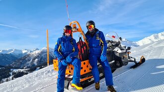 „Wenn auf den Skirouten oder auf der schwarzen Direttissima was passiert, dann schnallen wir die Skier an. Ansonsten reicht der Skidoo. Wie auf der Straße muss auch auf der Piste die Gefahrenstelle ABGESICHERT werden. Ein Folgeunfall wäre fatal. Dazukommende Passanten können hier einen wichtigen Beitrag leisten. Ski können etwa zum Absperren verwendet werden. Ich stelle meinen Skidoo quer und versorge den Patienten. Wichtig ist hier immer, RUHIG zu bleiben. Diese Charaktereigenschaft ist Grundvoraussetzung für einen Pistenretter“, erzählt Jonas. Der Puls ist immer im Normalbereich, ob bei den Kontrollfahrten auf der Piste oder bei einer Alarmierung. Aus der Ruhe bringt die Pistenretter also kaum was. Ich bin beeindruckt.