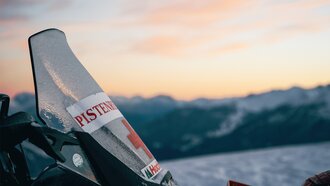 Die Skidoos SCHNURREN, der Zeitplan drängt. Die Pisten sollten vor den ersten Skifahrern kontrolliert sein. Ich nehme hinter Jonas Platz und schon geht es zügig bergwärts. Alles, was auf der Piste steht, wird von ihnen überprüft. Dabei ist ORANGE die Farbe der Stunde. Denn vieles, das auf den Pisten für Sicherheit sorgt, leuchtet in der grellen Farbe: Stangen, Pistenschilder und auch Matten um Lanzen, Schneeerzeuger, Stützen und Heustadel. „Es kann immer etwas passieren. Wir sorgen dafür, dass alle Gefahren möglichst minimiert werden. Bei den Kontrollfahrten richten wir die STANGEN am Pistenrand gerade. Bei Schlechtwetter sorgen sie für einen gut gekennzeichneten Pistenrand. Beschädigte Stangen werden ausgetauscht. Bei der Frommesabfahrt sind es insgesamt 650. Mit über 7 km ist sie die längste Abfahrt im Skigebiet. Bei den MATTEN schauen wir, dass die Öffnung immer auf der gegenüberliegenden Seite eines möglichen Aufpralls liegt“, erklärt mir Jonas.