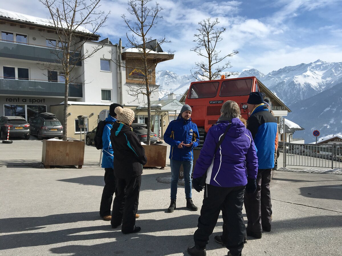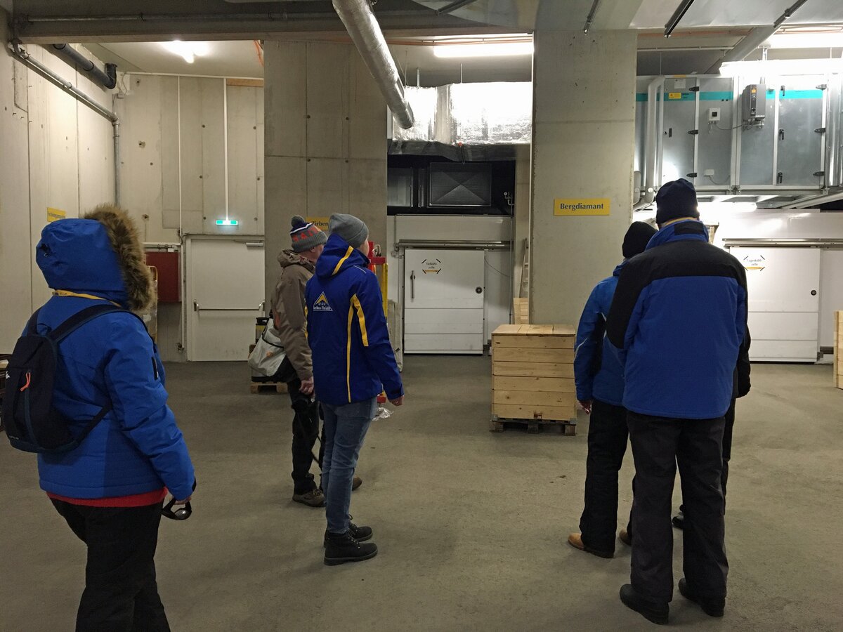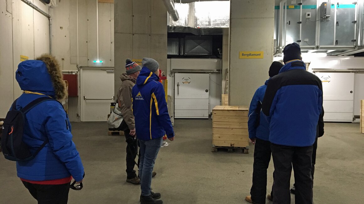 Unsere Führung begann ganz in der Nähe des Komfort-Skidepots in Fiss, wo sich der Lieferanteneingang der Seilbahn befindet. Hier werden täglich früh am Morgen sämtliche Lebensmittel und sonstige Materialien zentral angeliefert, damit einem reibungslosen Skibetrieb nichts im Wege steht. Hinter den riesigen Toren befinden sich eine große Halle und Kühlräume. Die Kühlräume werden genutzt, falls aufgrund diverser Umstände eine Anlieferung verspätet kommt. Damit kann garantiert werden, dass die Kühlkette nicht unterbrochen wird und es erfolgt eine Zwischenlagerung der Lebensmittel, welche zum nächstmöglichen Zeitpunkt an die Restaurants am Berg weiterverteilt werden.