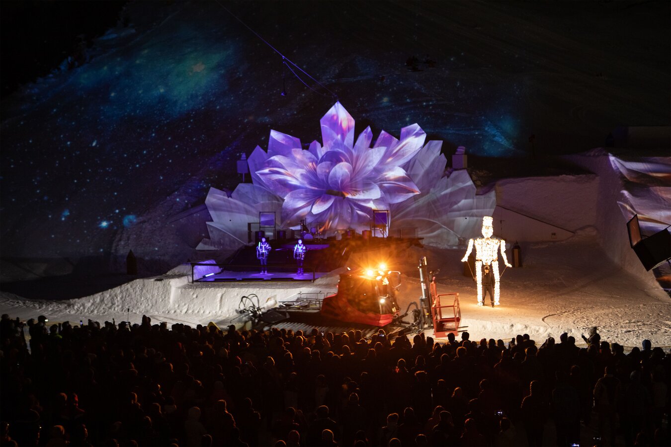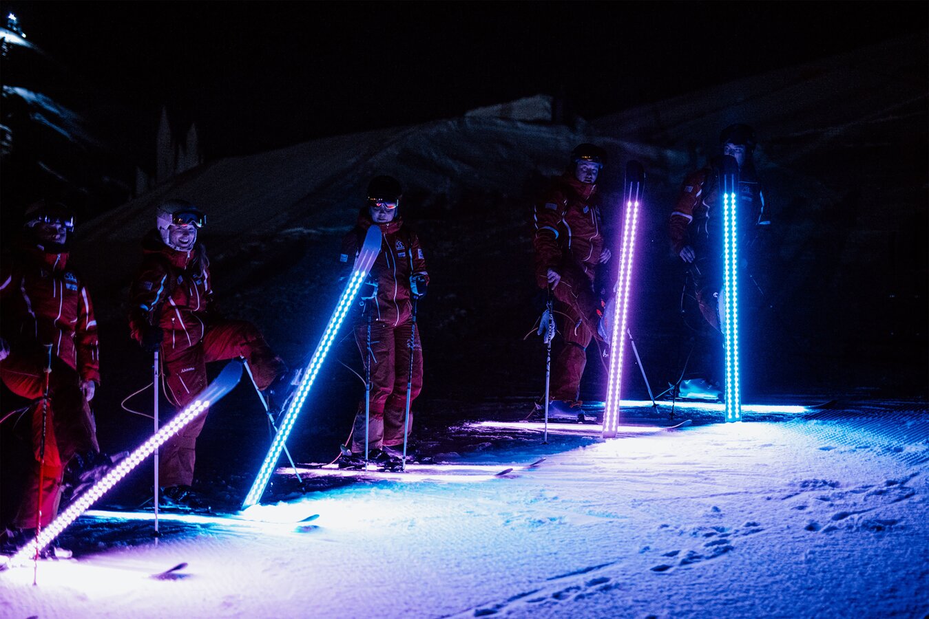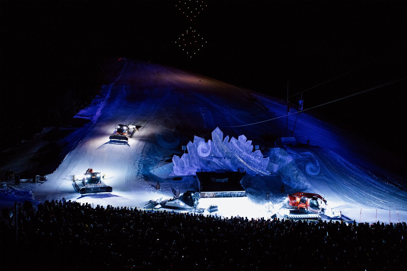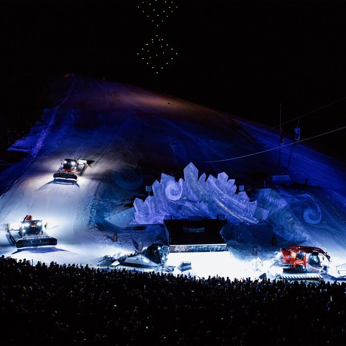 Mittlerweile füllt sich der Bereich vor der Bühne immer mehr: Bis zu 1800 Besucher kommen jeden Mittwoch zur Skishow, darunter auch viele Einheimische. Die Bühne, die in Kürze mit Licht- und Lasereffekten zum Leben erweckt wird, steht wie in einer Arena vor den Zuschauern, daneben führt die Piste in den Showbereich. Hier werden die Skilehrer der Skischule Serfaus ihr Können zeigen. „Bei aller Technik bleibt das Hauptelement der Show immer das Skifahren“, erklärt Alfons. Auch das Freeskier-Team von Shaper Goffi Gram ist in Serfaus dabei. Wie beim Nightflow im benachbarten Fiss zeigt die Truppe auf dem großen Kicker eindrucksvolle Tricks. Kurz vor der Show treffen wir noch das Ski-Demoteam, das mit ihren LED-Anzügen (übrigens auch selbst gebastelt!) verlässlich für Furore sorgt. Seit der Saison 2022/23 ist auch der Tiroler Drohnenpilot Günther Gold bei jeder Adventure Night am Start. Bis zu 50 Drohnen lässt der Profi gleichzeitig in die Luft und setzt dem bunten Treiben mit seinen außergewöhnlichen Flugkünsten die Krone auf. Eine ideale Ergänzung zum Feuerwerk, das nun im Sinne der Umwelt kleiner ausfallen kann.