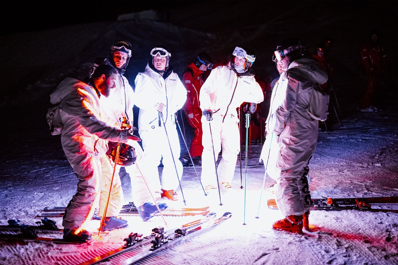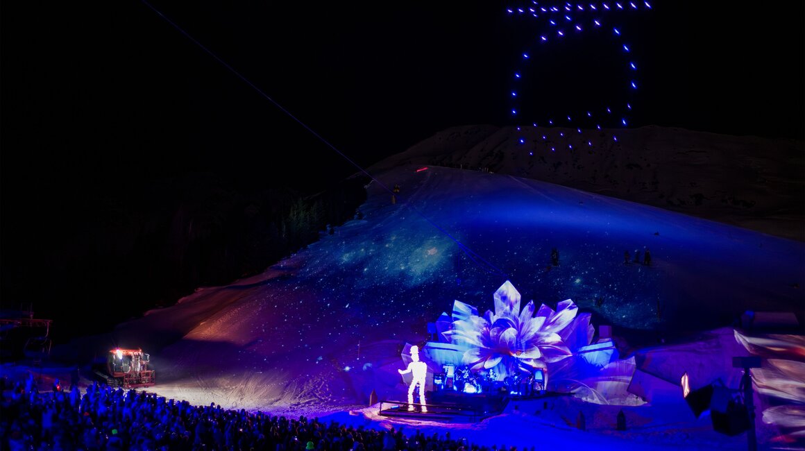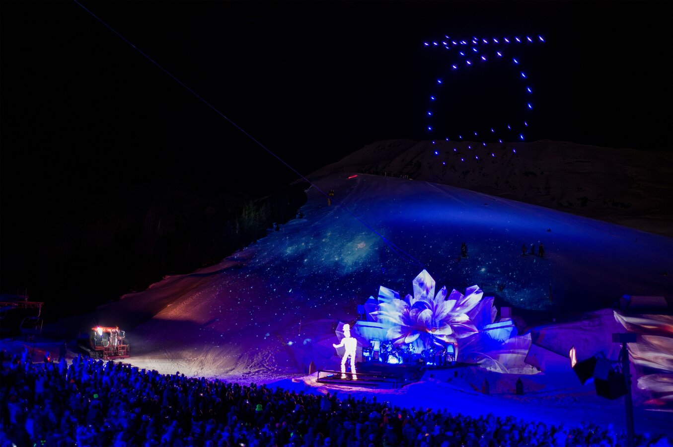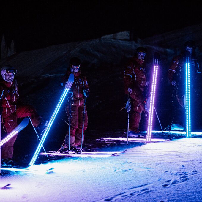 Mittlerweile füllt sich der Bereich vor der Bühne immer mehr: Bis zu 1800 Besucher kommen jeden Mittwoch zur Skishow, darunter auch viele Einheimische. Die Bühne, die in Kürze mit Licht- und Lasereffekten zum Leben erweckt wird, steht wie in einer Arena vor den Zuschauern, daneben führt die Piste in den Showbereich. Hier werden die Skilehrer der Skischule Serfaus ihr Können zeigen. „Bei aller Technik bleibt das Hauptelement der Show immer das Skifahren“, erklärt Alfons. Auch das Freeskier-Team von Shaper Goffi Gram ist in Serfaus dabei. Wie beim Nightflow im benachbarten Fiss zeigt die Truppe auf dem großen Kicker eindrucksvolle Tricks. Kurz vor der Show treffen wir noch das Ski-Demoteam, das mit ihren LED-Anzügen (übrigens auch selbst gebastelt!) verlässlich für Furore sorgt. Seit der Saison 2022/23 ist auch der Tiroler Drohnenpilot Günther Gold bei jeder Adventure Night am Start. Bis zu 50 Drohnen lässt der Profi gleichzeitig in die Luft und setzt dem bunten Treiben mit seinen außergewöhnlichen Flugkünsten die Krone auf. Eine ideale Ergänzung zum Feuerwerk, das nun im Sinne der Umwelt kleiner ausfallen kann.
