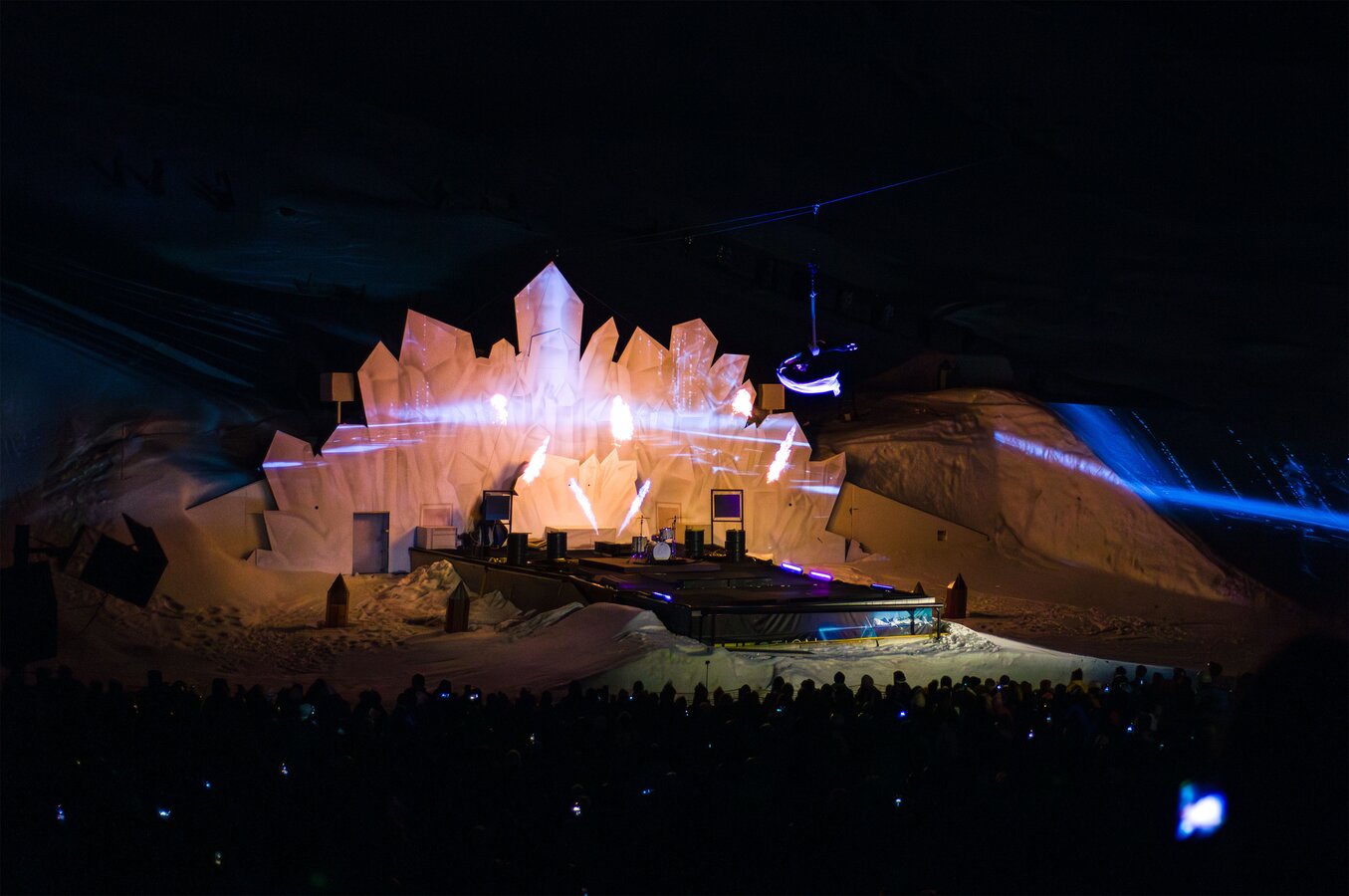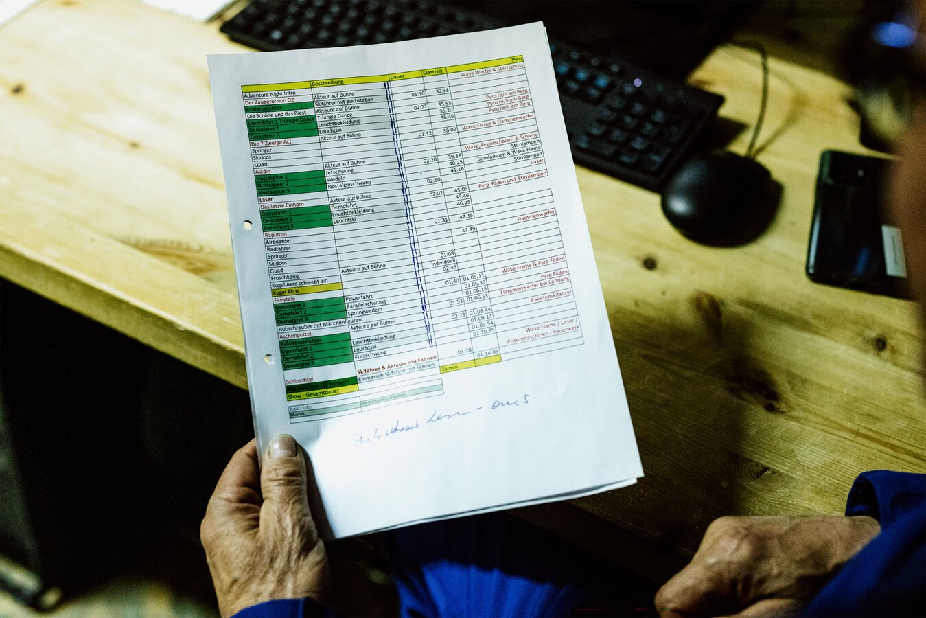 Nachdem Eva ihre Ideen präsentiert hat, wird bis im Herbst entschieden, welche Geschichte bei der Adventure Night in der kommenden Saison erzählt werden soll. Dann geht’s ans Eingemachte: Show Express liefert den Regieplan und die Timecodes, „dann bekommt jeder aus dem Team Hausübungen auf“, erzählt Alfons. Das heißt: Jeder Verantwortliche hat viel Arbeit zu erledigen, bis die große Generalprobe vor der ersten Show ansteht. Da müssen Lichter revisioniert und Laser einprogrammiert werden, Lampen aufgehängt, der 3D-Beamer und die Musikanlage eingestellt werden. Neben den technischen Feinheiten warten auch jede Menge kleinere Bauvorhaben: Die unterirdische Bühne wird angepasst und Spezialeffekte wie etwa Flammenwerfer werden gebaut. Für die letztjährige Fairytale-Show hat Alfons selbst zum Beispiel eine Aladdin-Lampe entwickelt. „Da sollte natürlich unbedingt Rauch aufsteigen“, sagt er – und man merkt ihm an, dass er mit viel Leidenschaft an all diesen Dingen feilt. Mit der wichtigste Part in den ganzen Vorbereitungen ist der Timecode Player: „Wir haben eine Zeitspur, in der alles – jeder Einsatz, jedes Licht, jedes Feuerwerk – ganz genau programmiert ist. Hier darf kein Fehler passieren.“