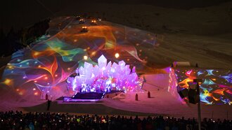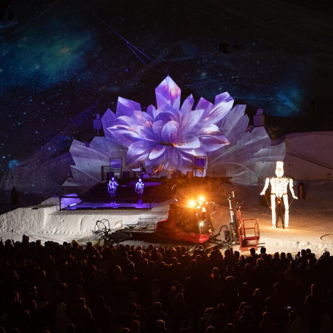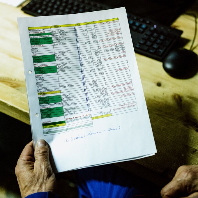 Die Uhr auf dem Timecode blinkt: Es ist punktgenau 20.29 Uhr an diesem Mittwochabend und auf der Piste erscheint ein Countdown. Die Zeit bis zum Beginn der Skishow läuft offiziell, ab jetzt muss alles punktgenau klappen: „Wir geben uns mit dieser Einstellung eine Minute Vorlauf, um zu sehen, ob alles klappt. Ab 20.30 Uhr ist das Feuerwerk aktiviert, damit pünktlich um 21.00 Uhr der erste Pyroeffekt in den Himmel pfeift und die Show eröffnet“, erklärt Alfons Wucherer. Er arbeitet bei der Seilbahn Komperdell GmbH in Serfaus als Betriebsleiter und ist hauptverantwortlich für die große Skishow, die jede Woche unter freiem Himmel stattfindet. „Die ersten Versuche einer Adventure Night gab es bereits 2002, 2004 kam ein erster Laser dazu, dann Lichtanlagen mit Verfolger und Feuerwerke“, erzählt Alfons. Seit 2009 ist er Teil des Teams und mittlerweile ist aus der einfachen Skishow eine Stunde spektakuläre Unterhaltung geworden. Das wird spätestens dann klar, als eine Tuchakrobatin hoch über der Bühne schwebt und schwindelerregende Kunststücke vollführt. Aber - der Reihe nach!