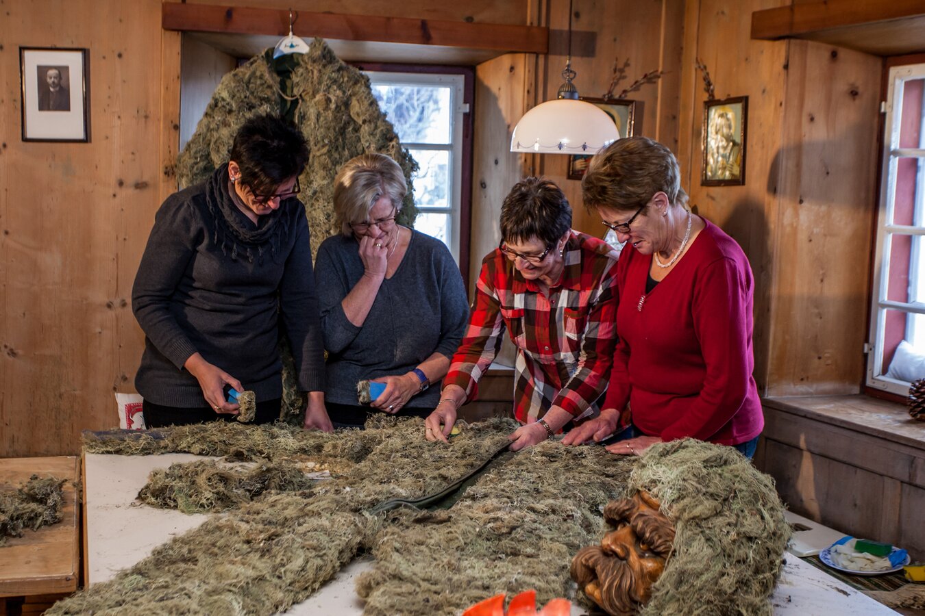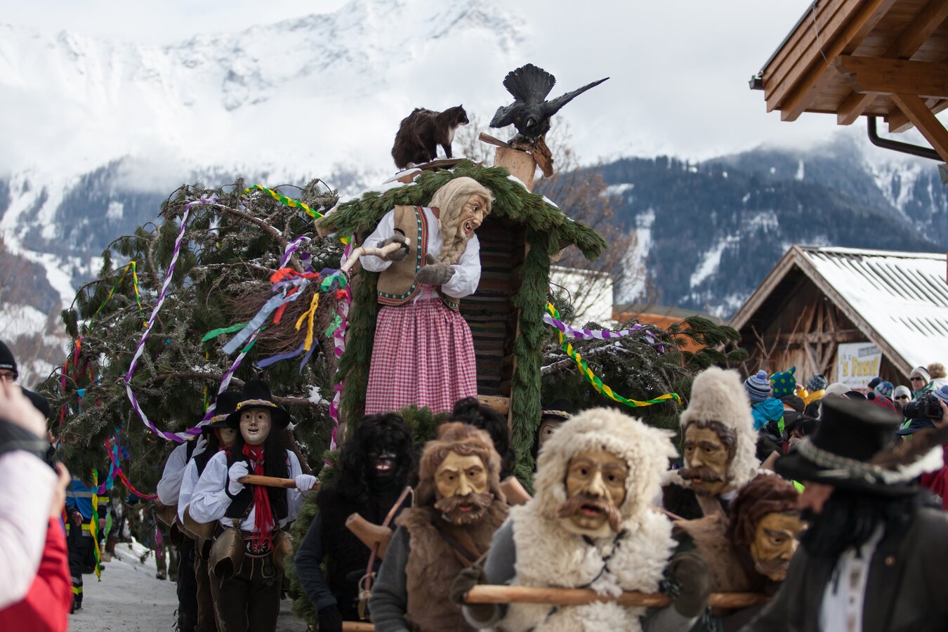 Der Miassmann und der Bär tragen mit vereinten Kräften sehr viel dazu bei, dass der Bloch am Ende des Umzugs an seinem Bestimmungsort, beim sogenannten „Fonnes“, im Dorfzentrum landet.