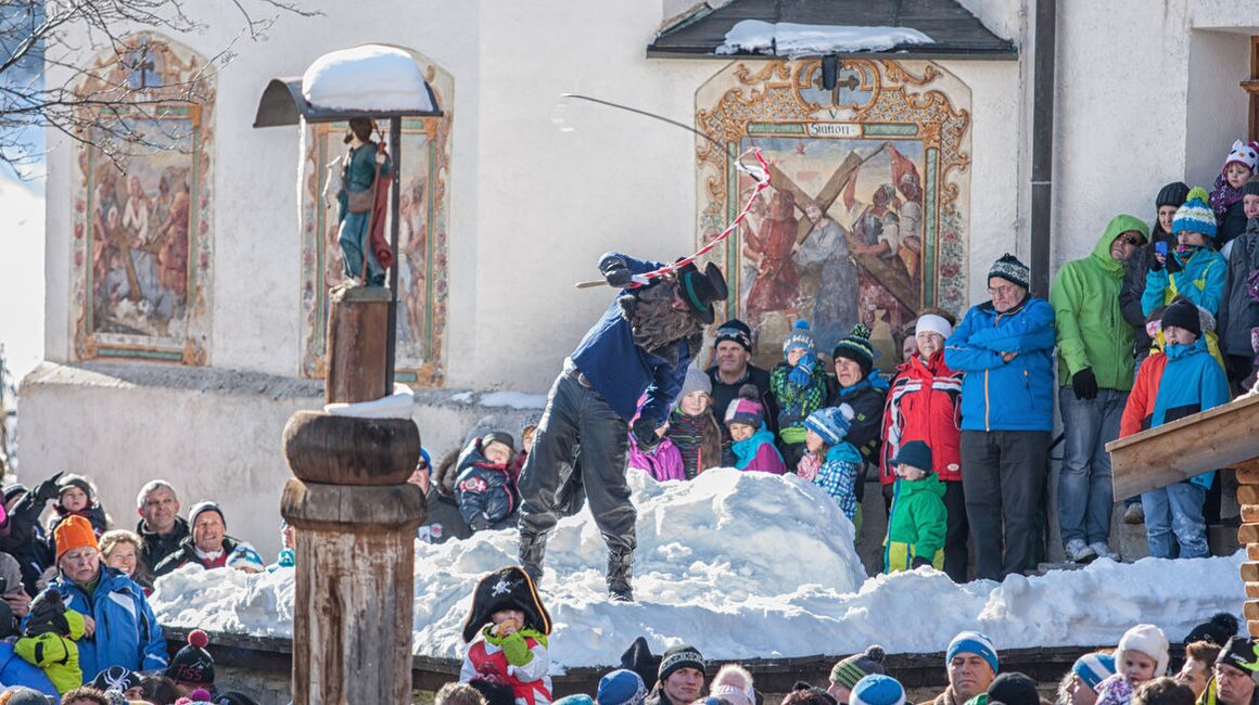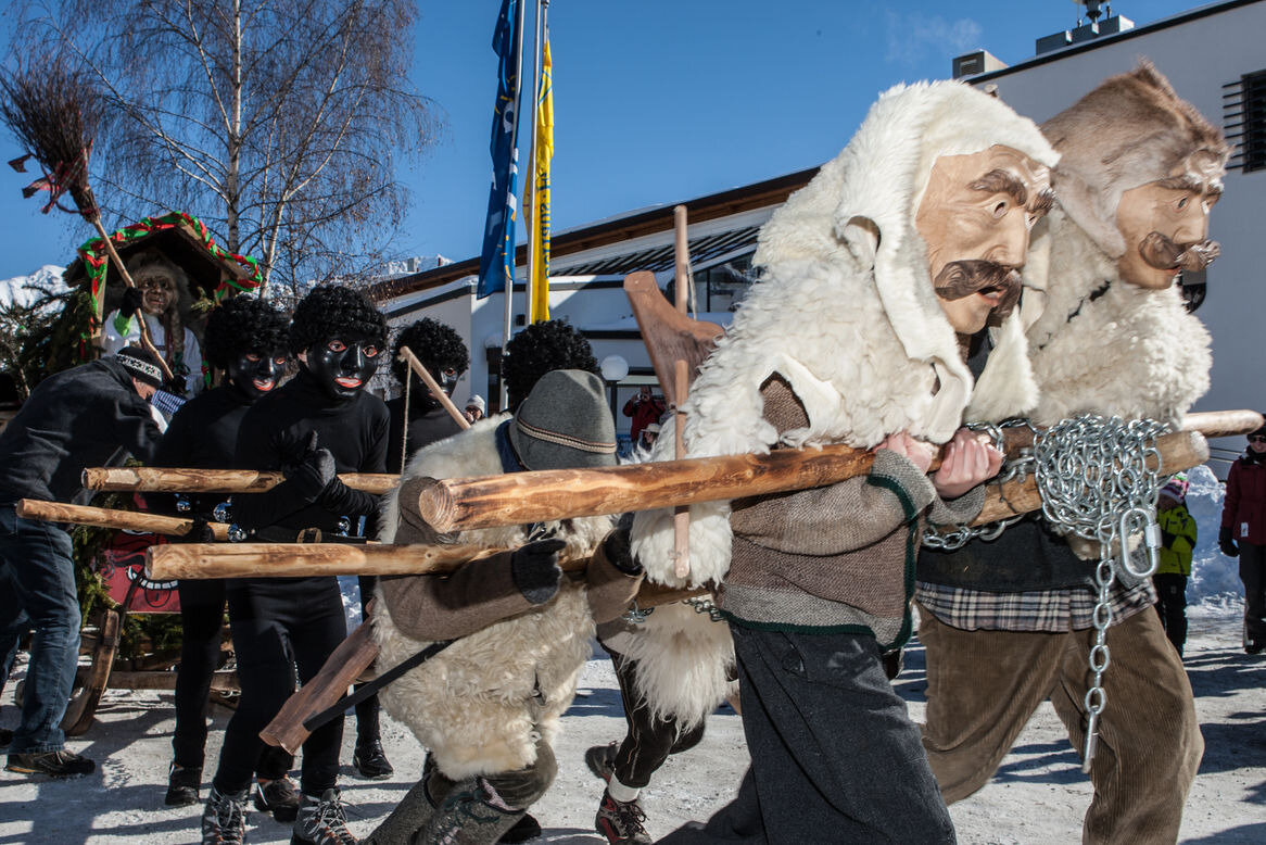 Als wir zurückkamen, gingen wir zum Baum und der Fuhrmann schnalzte. Das war das Kommando zum Losziehen. Vorne waren die Bärentreiber, Mohrelen und Schallner. Die Paarlen, die Holzer und Jäger zogen in der Mitte des Baumes und ganz hinten bremste der Schwoaftuifl. Die Hexen machten mit ihren Besen den Weg frei. Der Bajatzl und der Giggeler waren immer in Aktion. Die Zwerglen haxelten die Menschen mit Ihren Stöcken.