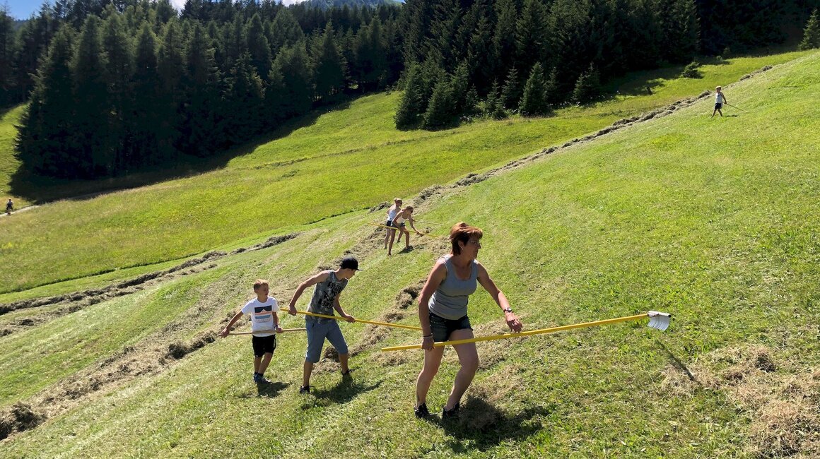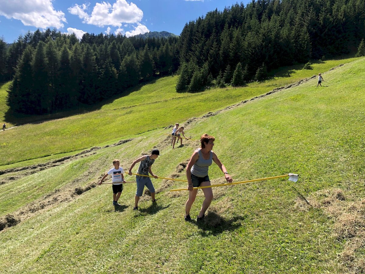 Diese Arbeit der Bauern ist also keinesfalls planbar. Wie damit umgegangen werden kann, verrät dir Familie JENEWEIN aus Ladis: „Unsere Tiere sind auf dem Berg, somit ist die Stallarbeit vorbei und es geht mit der Heuarbeit los. Im Gegensatz zur Stallarbeit ist die Arbeit auf den Wiesen NICHT PLANBAR. In den Stall gehen wir jeden Tag um die gleiche Uhrzeit. Heuen dagegen ist WETTERABHÄNGIG. Im Sommer hoffen wir immer auf ein paar sonnige Tage in Folge. Wenn das Wetter passt, muss es schnell gehen. Da hilft die ganze Familie mit.“ VIELE HÄNDE bereiten der Arbeit ein schnelles Ende. So ist es auch beim Heuen. Viel wird noch händisch erledigt.
