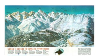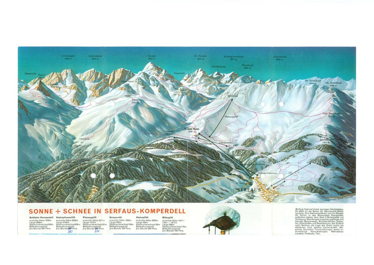 Erst vier Jahrzehnte nach Erscheinen der Tourenkarte vom Hotel Obladis wurden die ersten Aufstiegshilfen am Hochplateau gebaut und revolutionierten den Skilauf. Einst waren die Sportler schon vom mühevollen Aufsteigen oder Hinauftreten auf den Berg AUFGEWÄRMT und müde. Die Genussabfahrten musste man sich damals erst verdienen. Mit der positiven touristischen Entwicklung wurden natürlich auch Pistenpläne abgedruckt, die den Wintersportler als NAVI AUF DEN PISTEN dienten. Aus welchem Jahr stammt wohl dieser Pistenplan vom einst autonomen Skigebiet Serfaus?