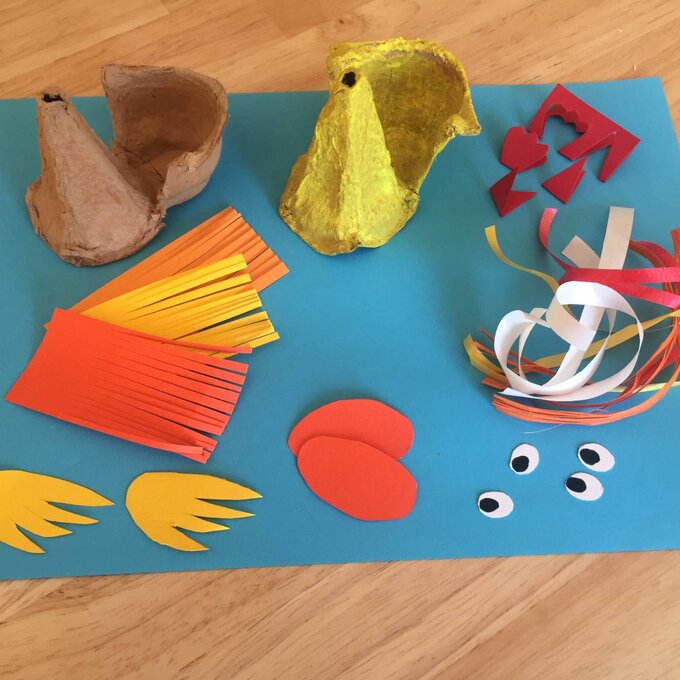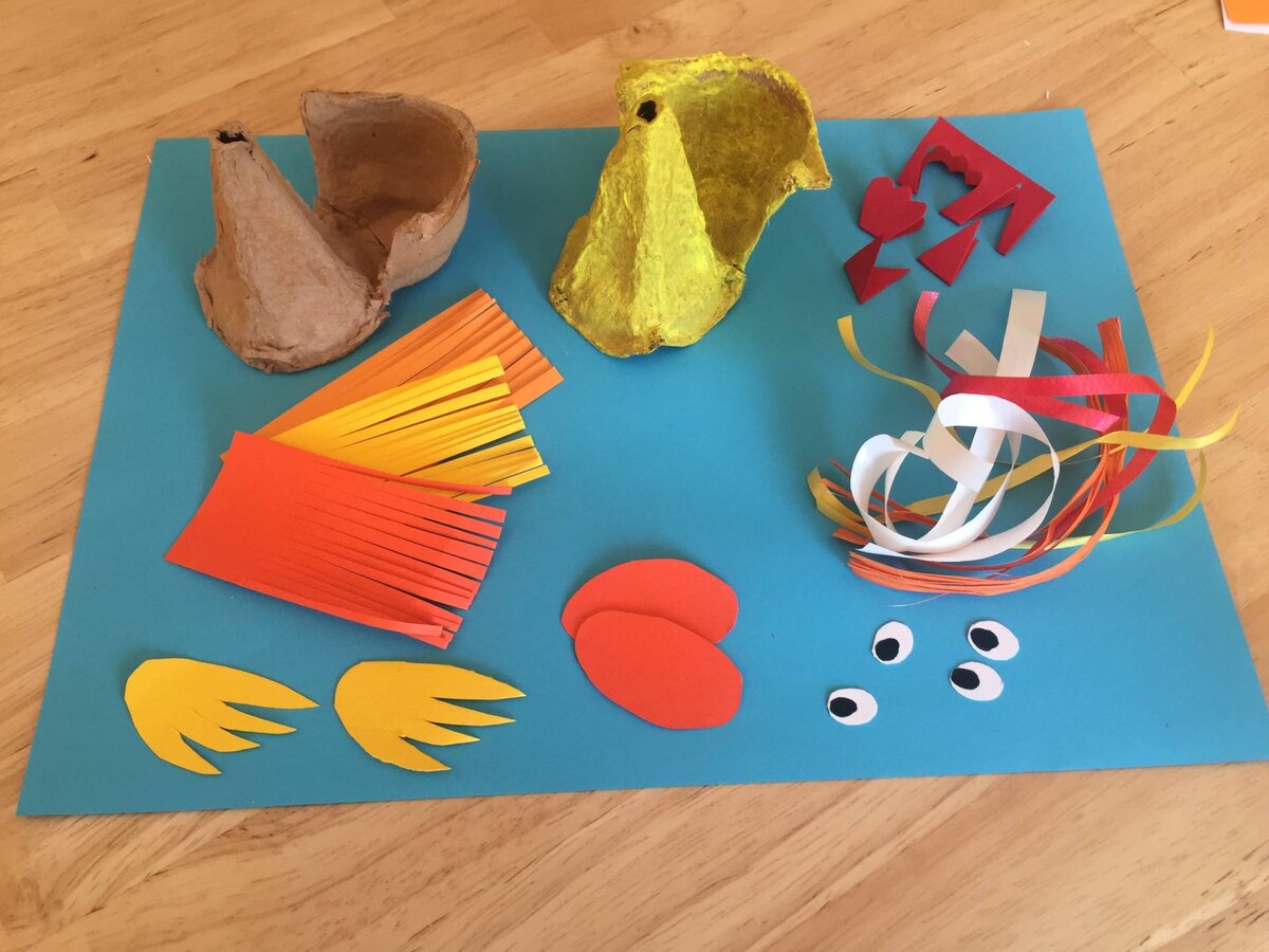 - Buntes Tonpapier (für Flügel, Hühnerkamm, Schnabel, Schwanzfedern, evtl. Augen)