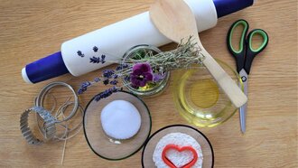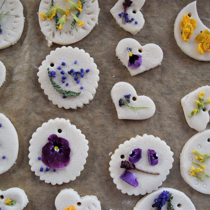 ☑ Mehl ☑ Wasser ☑ Salz ☑ verschiedene Blüten oder Kräuter ☑ Keksausstecher ☑ Schüssel + evtl. Kochlöffel ☑ Teigroller ☑ Strohhalm ☑ Schere ☑ Bänder