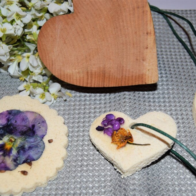 Schritt 3 - Trocknen lassen Wenn du mit deinen Kunstwerken fertig bist, wird noch etwas Geduld benötigt. Lege die Salzteig-Anhänger draußen in die Sonne zum Trocknen auf. Bis diese vollständig trocken sind, dauert es ca. 2-3 Tage. Die "Blüten im Salzteig" kannst du aber auch schneller trocknen lassen. Dafür legst du diese auf ein mit Backpapier ausgelegtes Backblech und lässt das Salzgebäck je nach Dicke im Backrohr trocknen. Für je 5 mm Dicke musst du eine Stunde Backzeit einplanen. Um Risse zu verhindern, erhöhst du die Backtemperatur schrittweise. Ist die Mitte der Unterseite hart, ist der Teig durchgetrocknet. Nun auskühlen lassen.