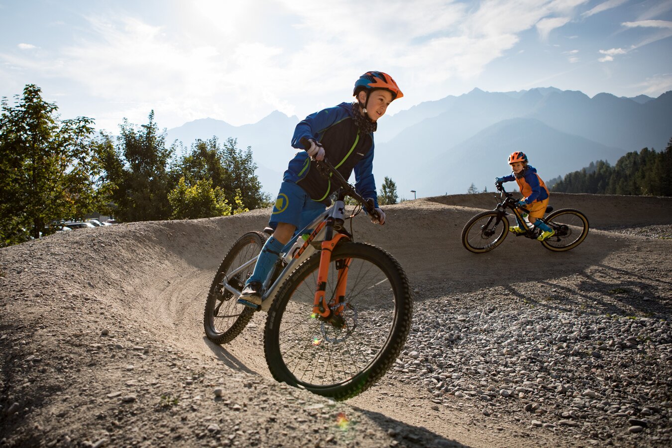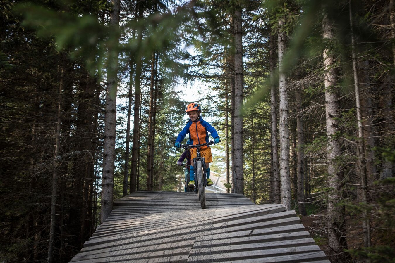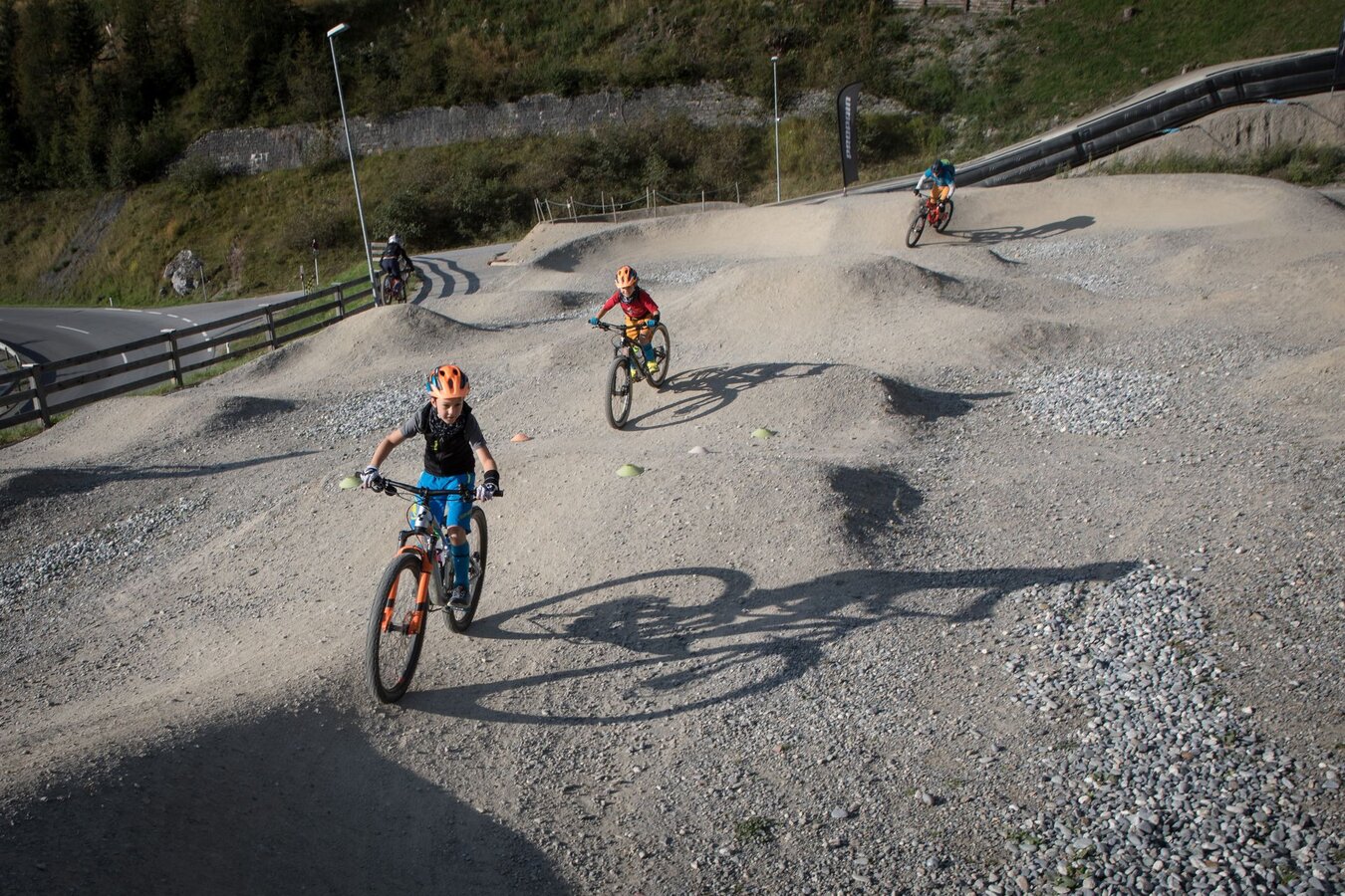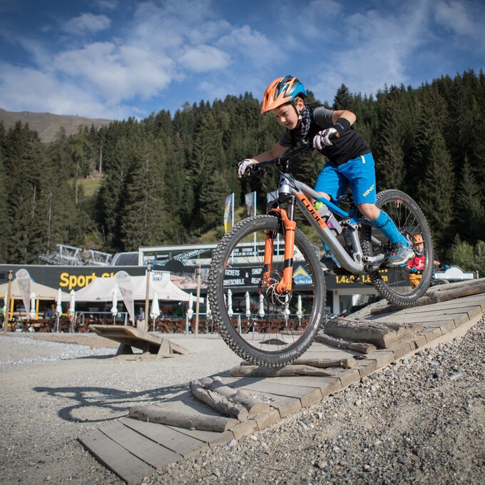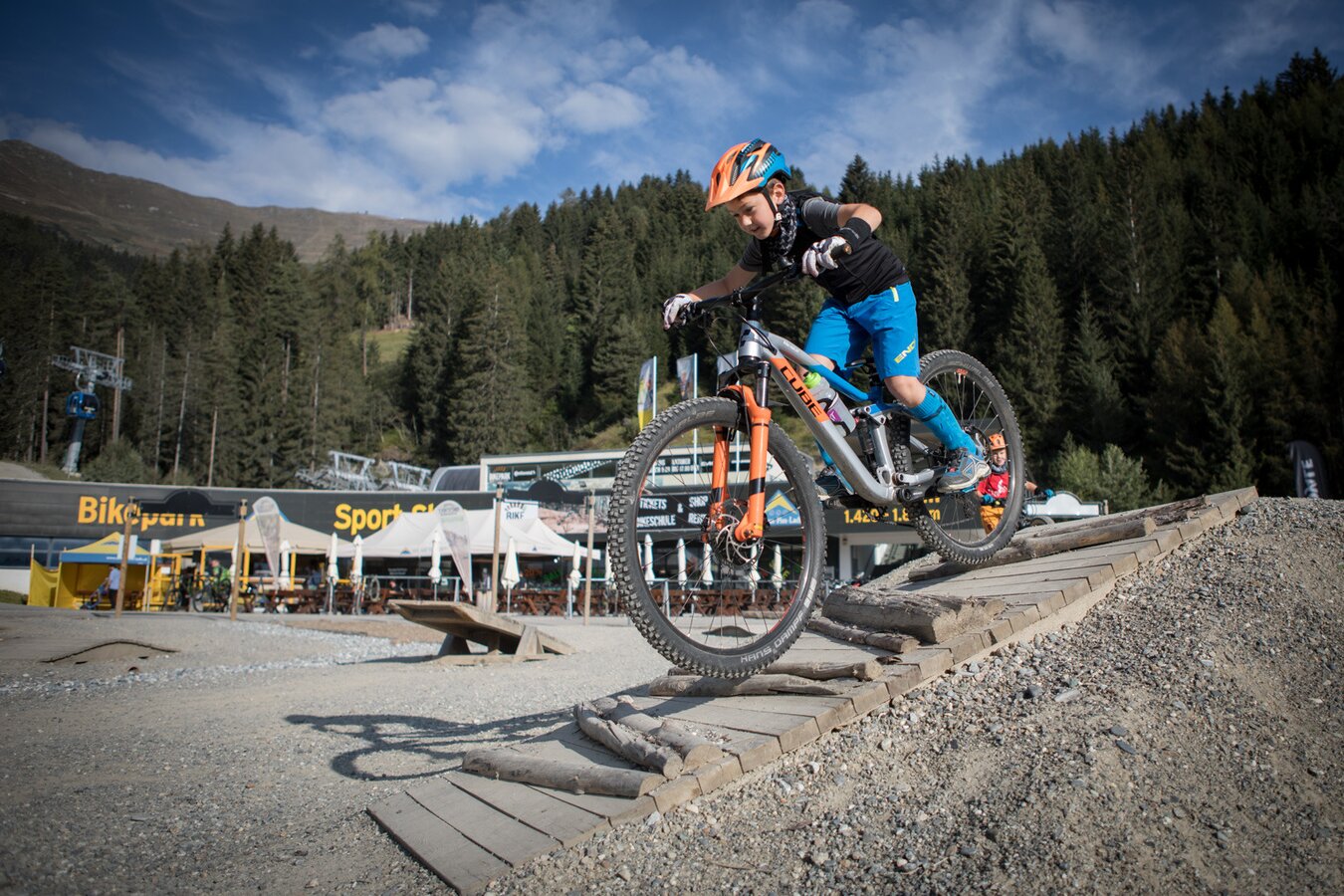 Unser Plan ist es, zuerst ein paar Runden im Bikepark auf den verschiedenen geshapten Lines zu drehen, bevor wir uns auf die hochalpinen Singletrails wagen. Wir sind bestens ausgestattet und wärmen uns sogleich im direkt vor dem Shop befindlichen Pumptrack und der angeschlossenen Training Area etwas auf. Meine Jungs lieben es, ihre Bikes über die Wellenbahn zu jagen und sich in die Kurven zu schmeißen. Da fällt es mir teilweise schon schwer, mit ihnen mitzuhalten. Doch schon nach kurzer Zeit kommt wieder einmal das Kind in mir durch und ich folge ihnen mit einem breiten Grinsen im Gesicht. Nicht nur die Wellenbahn, auch die verschiedenen Hindernisse machen richtig Spaß und eignen sich extrem gut dafür, das richtige Gefühl fürs Bike zu bekommen, um später auf den verschiedenen Lines im Bikepark Spaß zu haben.