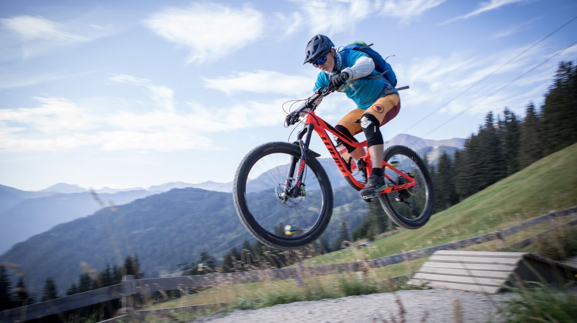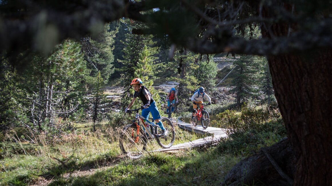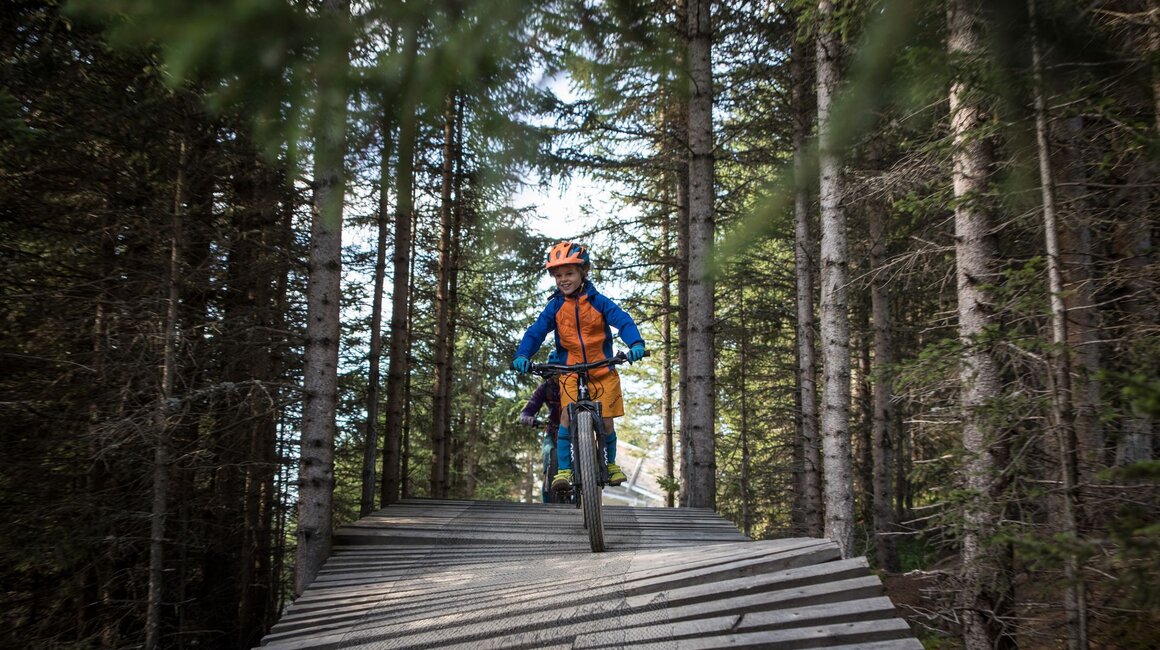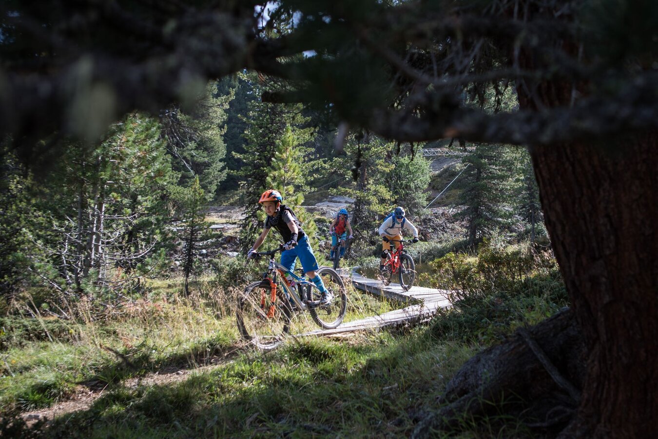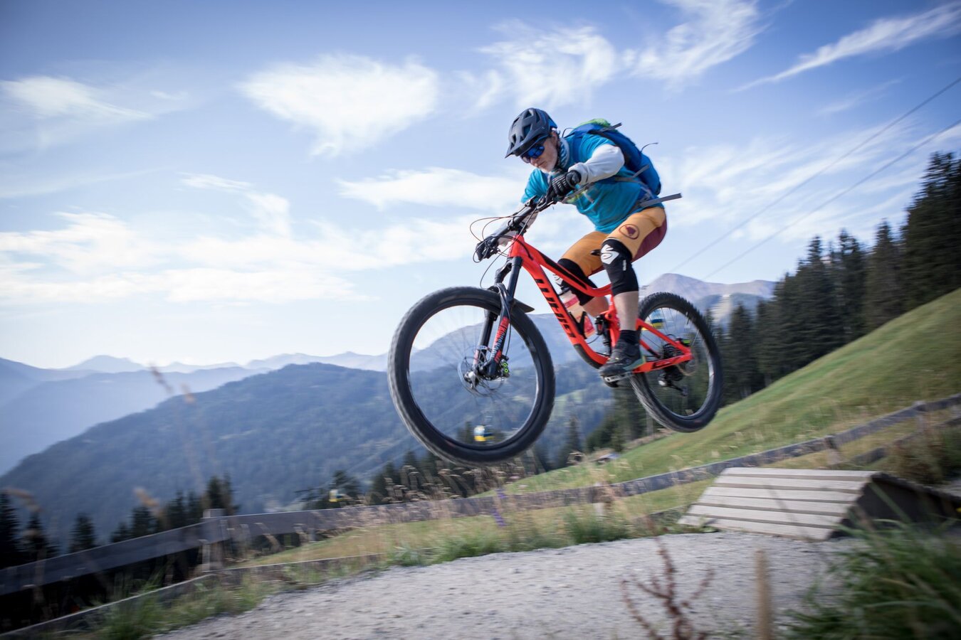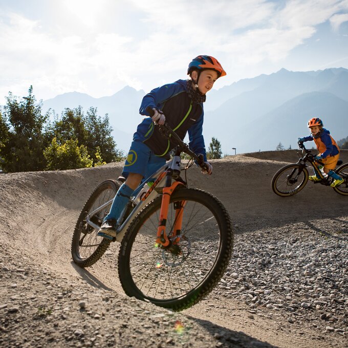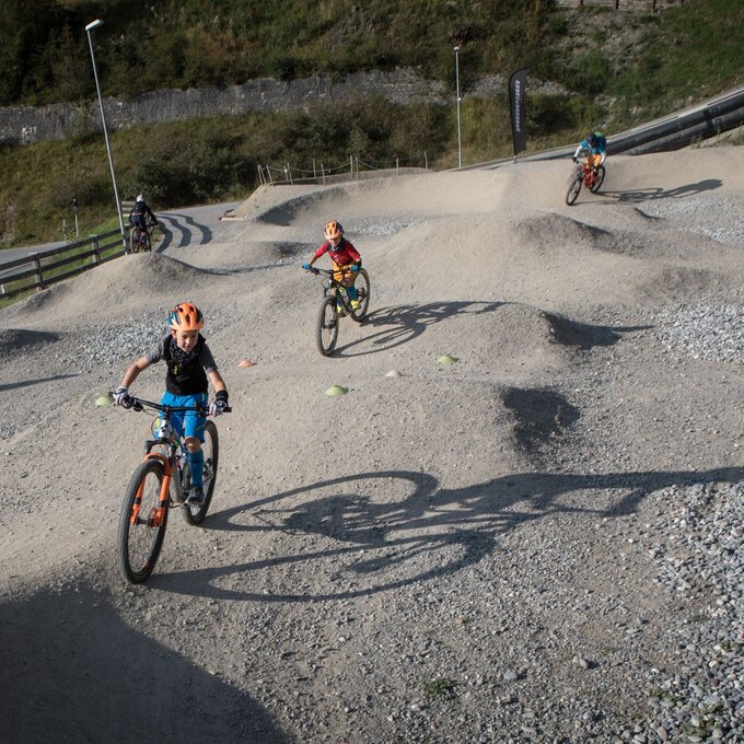 Unser Plan ist es, zuerst ein paar Runden im Bikepark auf den verschiedenen geshapten Lines zu drehen, bevor wir uns auf die hochalpinen Singletrails wagen. Wir sind bestens ausgestattet und wärmen uns sogleich im direkt vor dem Shop befindlichen Pumptrack und der angeschlossenen Training Area etwas auf. Meine Jungs lieben es, ihre Bikes über die Wellenbahn zu jagen und sich in die Kurven zu schmeißen. Da fällt es mir teilweise schon schwer, mit ihnen mitzuhalten. Doch schon nach kurzer Zeit kommt wieder einmal das Kind in mir durch und ich folge ihnen mit einem breiten Grinsen im Gesicht. Nicht nur die Wellenbahn, auch die verschiedenen Hindernisse machen richtig Spaß und eignen sich extrem gut dafür, das richtige Gefühl fürs Bike zu bekommen, um später auf den verschiedenen Lines im Bikepark Spaß zu haben.