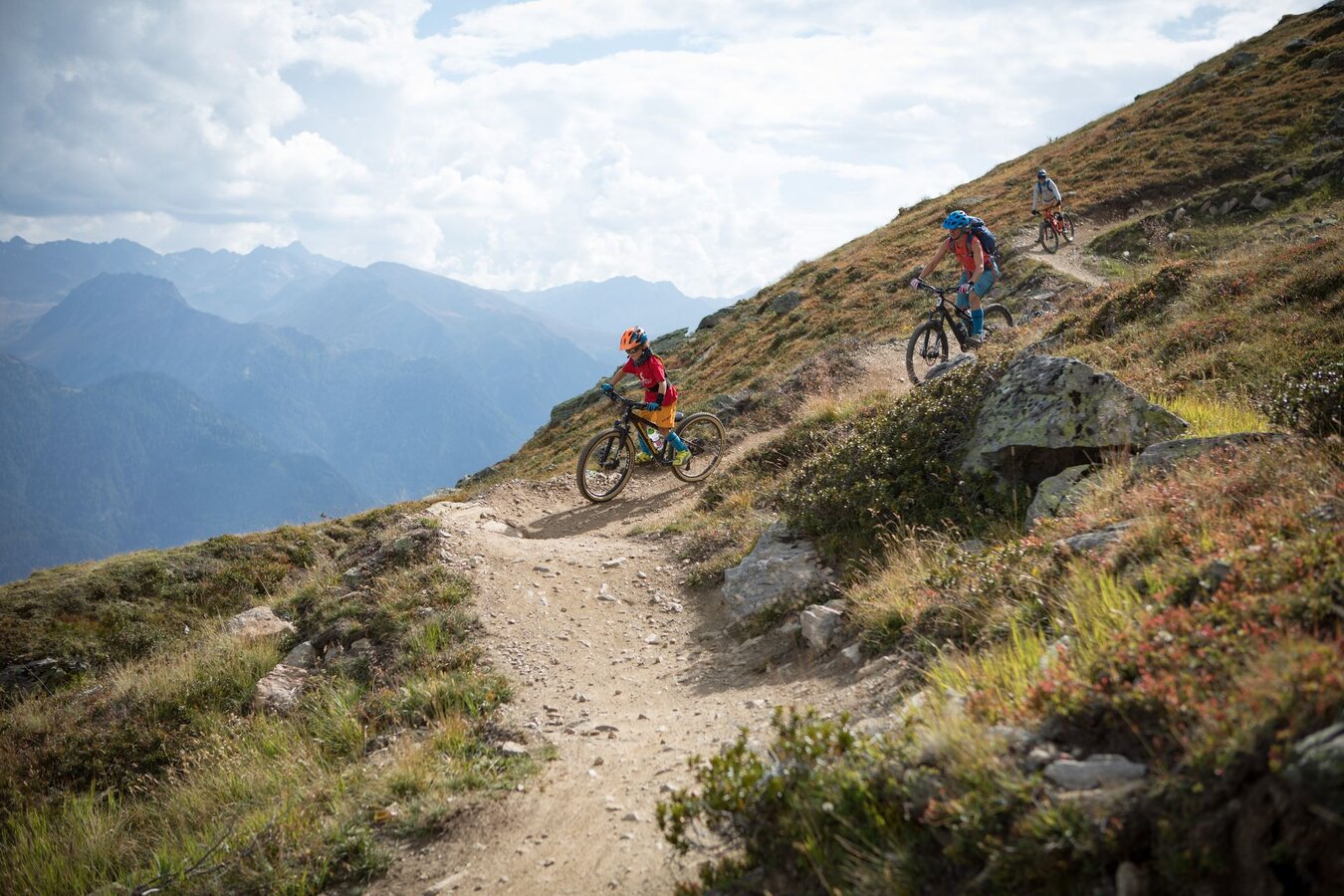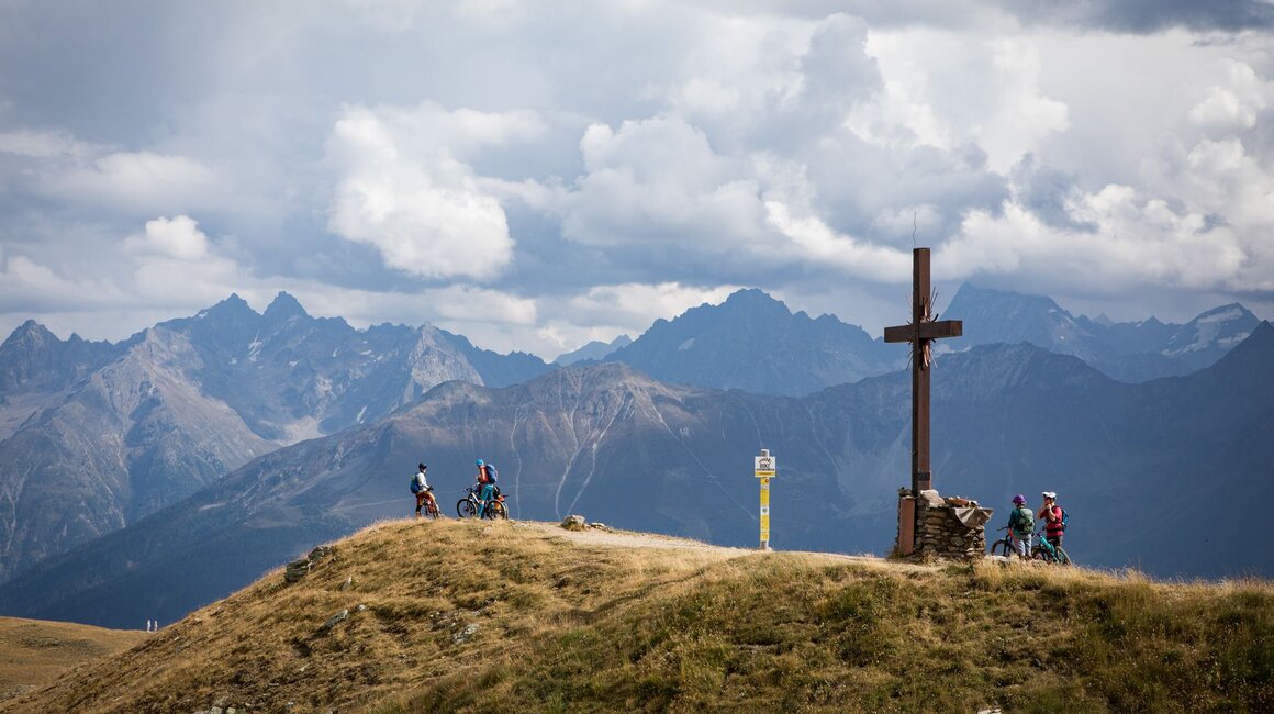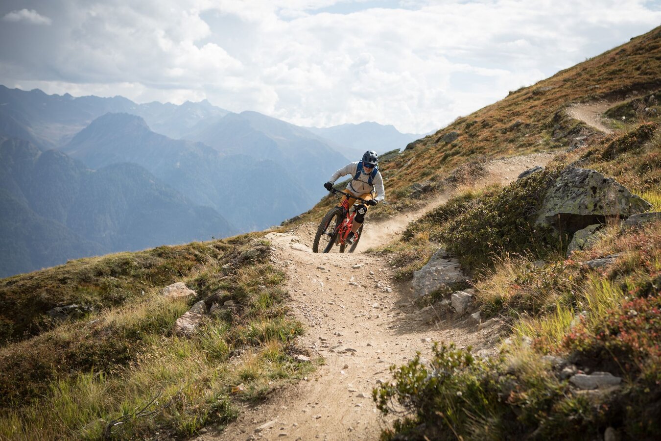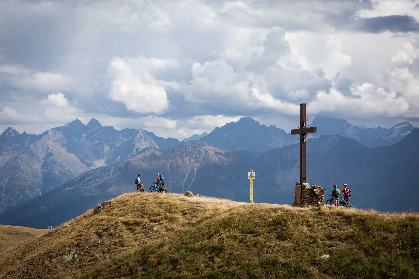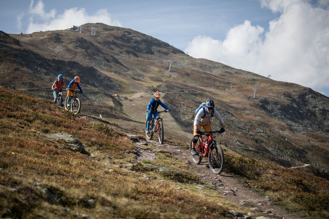 Gedopt mit Koffein und Kuchen sind dann auch wir „Alten“ soweit, die nächsten zwei Highlights in Angriff zu nehmen: den blauen Zirbentrail, der den Zwölferkopf und das Fisser Joch miteinander verbindet, und den roten Frommestrail, der über das Frommeskreuz hinunter nach Fiss führt. Beide aneinander gereiht ergeben, unterbrochen von einer kurzen Aufwärtspassage, insgesamt knapp über 1.200 Höhenmeter Abfahrt. Ja, das ist viel, aber gerade der Frommestrail führt speziell im oberen Teil durch eine, besonders im Herbst, extrem schöne und reizvolle Landschaft und bietet unzählige Aussichtspunkte, von denen aus man einen genialen Rundumblick auf die Lechtaler-Alpen, das Inntal, die Ötztaler-Alpen, die Nauderer-Berge und die schroffen Gipfel des Unterengadins hat. Da muss man einfach immer wieder stehen bleiben und schauen.