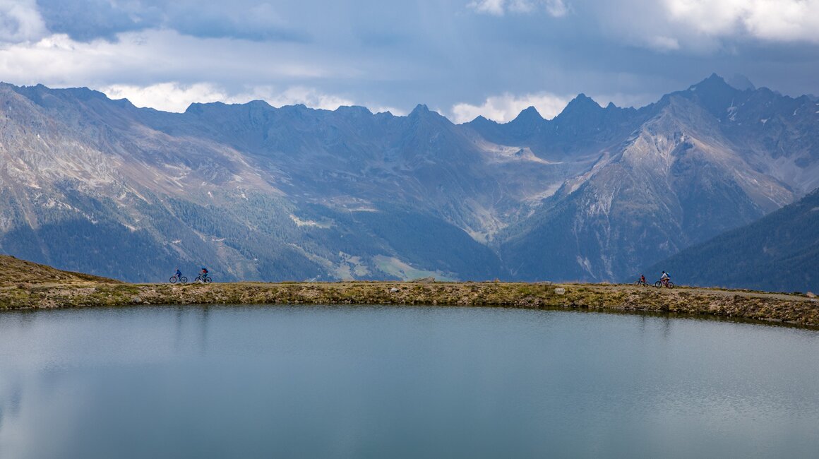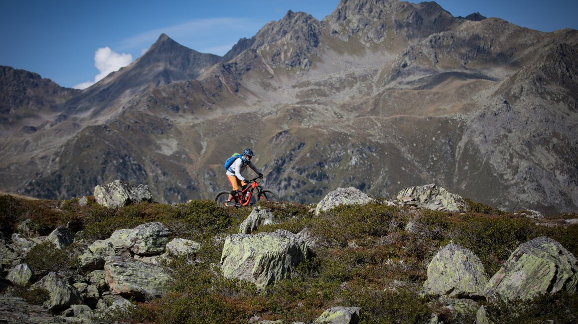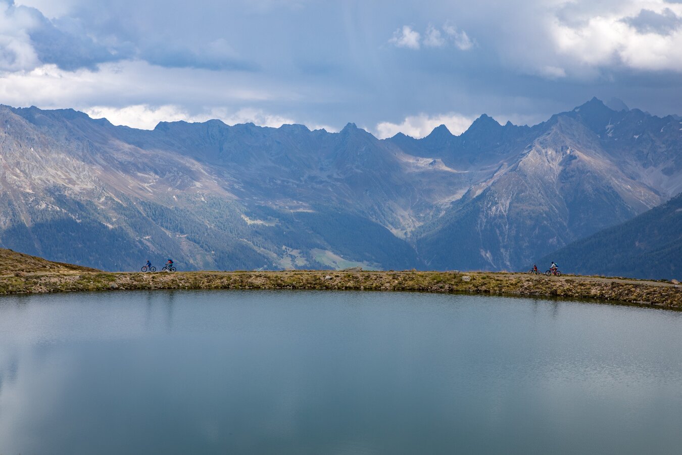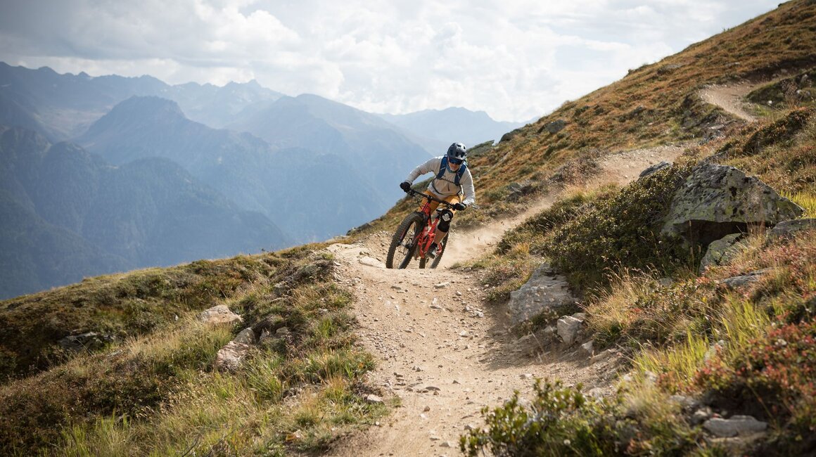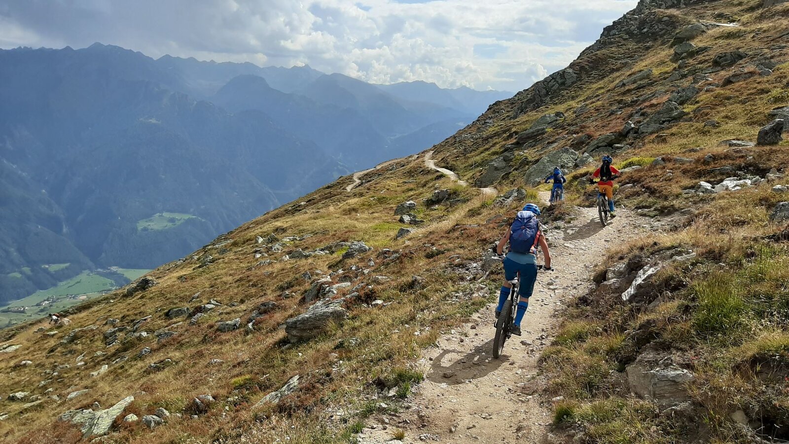 Gedopt mit Koffein und Kuchen sind dann auch wir „Alten“ soweit, die nächsten zwei Highlights in Angriff zu nehmen: den blauen Zirbentrail, der den Zwölferkopf und das Fisser Joch miteinander verbindet, und den roten Frommestrail, der über das Frommeskreuz hinunter nach Fiss führt. Beide aneinander gereiht ergeben, unterbrochen von einer kurzen Aufwärtspassage, insgesamt knapp über 1.200 Höhenmeter Abfahrt. Ja, das ist viel, aber gerade der Frommestrail führt speziell im oberen Teil durch eine, besonders im Herbst, extrem schöne und reizvolle Landschaft und bietet unzählige Aussichtspunkte, von denen aus man einen genialen Rundumblick auf die Lechtaler-Alpen, das Inntal, die Ötztaler-Alpen, die Nauderer-Berge und die schroffen Gipfel des Unterengadins hat. Da muss man einfach immer wieder stehen bleiben und schauen.