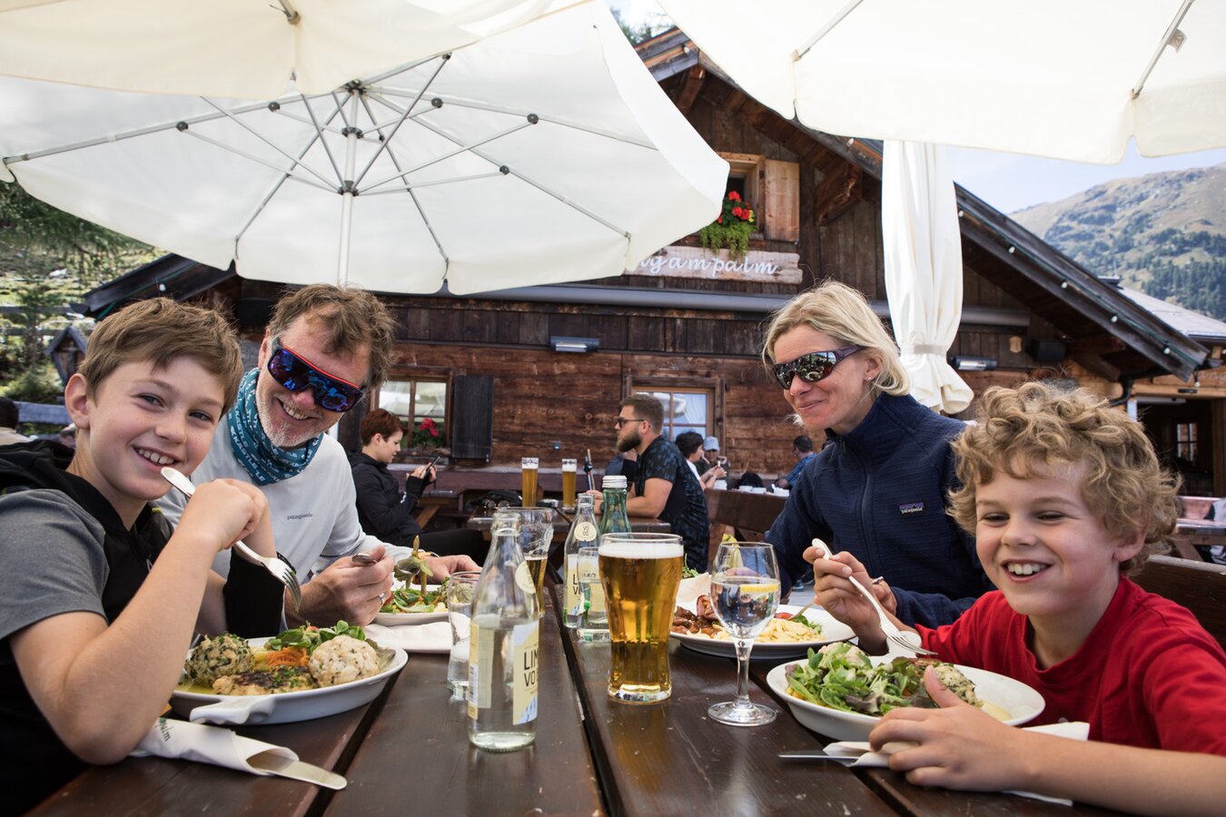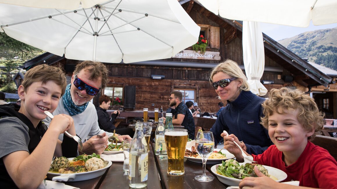 Aber wie bringt man Kinder von so einem lässigen Spielplatz weg? Indem man sie daran erinnert, dass sie Hunger haben und dass es ein paar hundert Höhenmeter tiefer auf der Schöngampalm geniale Knödel gibt. Die Jungs haben angebissen und wir werfen uns voller Vorfreuden wieder auf unsere Drahtesel. Fast schon einsam über perfekt gepflegte Naturtrails zu cruisen, macht jetzt auch Teresa richtig Spaß und sie kann gar nicht mehr aufhören zu grinsen.