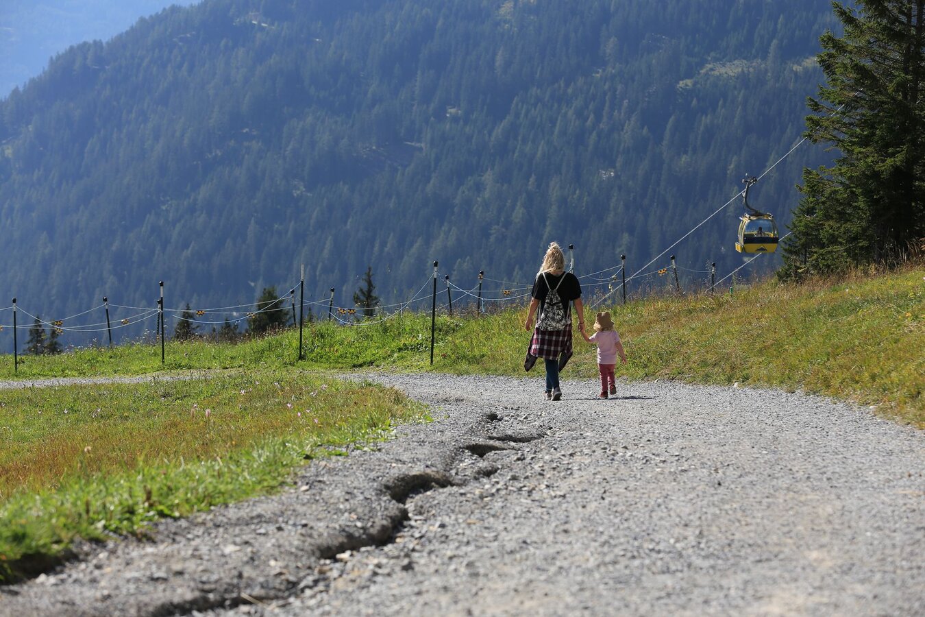“Goti, Beerla!“ Die Kinderaugen leuchten fröhlich als sie die Waldbeeren und prächtigen Blumen entdeckt. Natürlich lassen wir die Pflanzen stehen, da viele streng geschützt sind und in der freien Natur nicht gesammelt oder beschädigt werden dürfen. Bereits am Ende des Waldes offenbart sich eine eindrucksvolle Landschaft und auch das Ziel können wir schon sehen. Je weiter wir hinauskommen, desto mehr öffnet sich der wunderbare Blick in Richtung Fiss und Serfaus. An der Abzweigung bei dem Aussichtspunkt beschließen wir eine kurze Rast zu halten und dann noch weiter Richtung Waldbahn nach Fiss zu wandern, wo man wagemutige Downhiller beim Springen im Bikepark Serfaus-Fiss-Ladis beobachten kann. 1, 2, 3, looos! Antonia hat sichtlich Spaß daran und klatscht nach jedem Sprung.