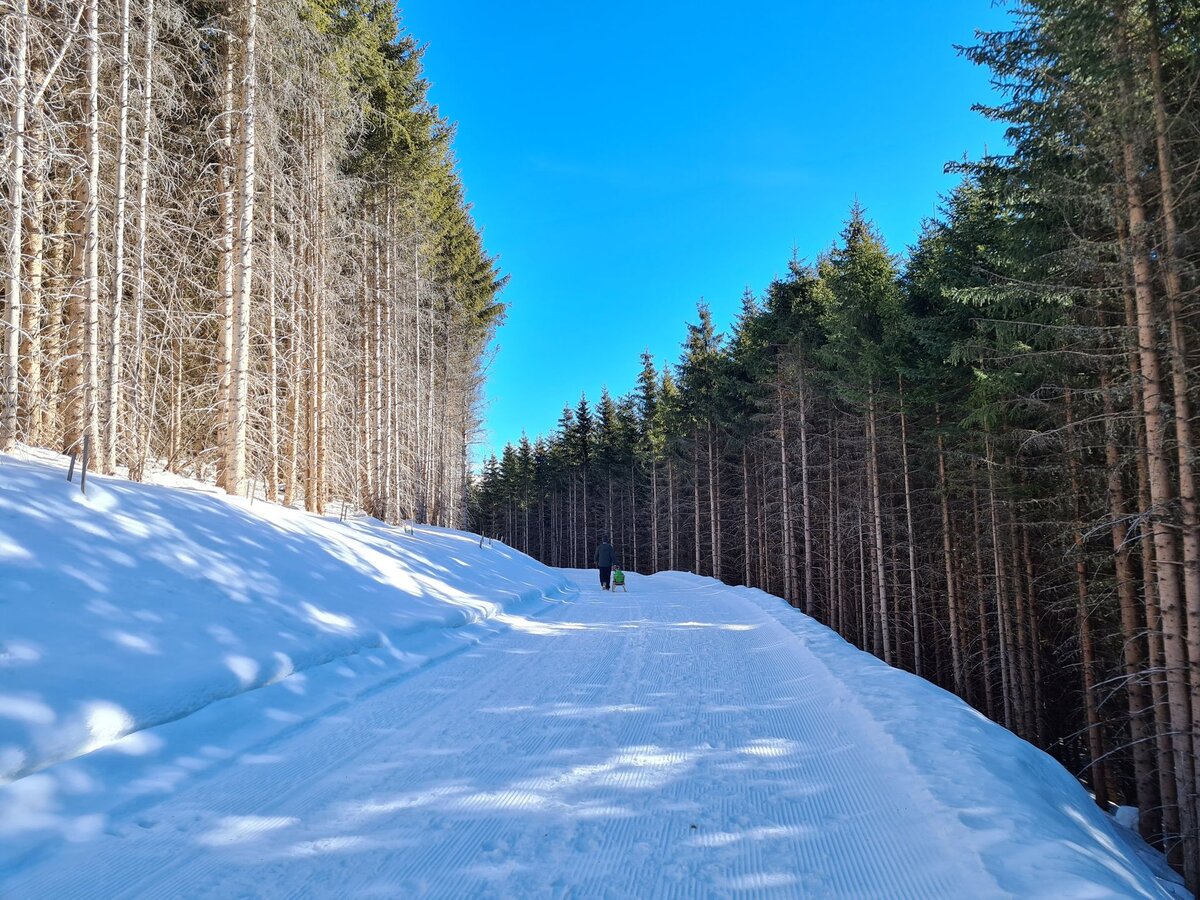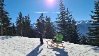 Entlang des Weges gibt es zahlreiche Möglichkeiten, um eine Pause einzulegen und Platz zu nehmen. Auch wir suchen uns ein sonniges Plätzchen. Wir genießen die Aussicht, toben im Schnee und prosten uns mit unseren mit Tee gefüllten Thermoskannen zu. Ich werde wieder schwach und lasse mich von dem Zweieinhalbjährigen überreden, ihm einen "Gutz" zu geben, also etwas zum NASCHEN, und krame in meinem Rucksack danach. Zum Glück werde ich fündig. Auch ich gönne mir ua Gutzala. Zufrieden lauschen wir entspannt dem Vogelgezwitscher. Wir zwei Männer schweigen, genießen und lassen das bisher Erlebte Revue passieren.
