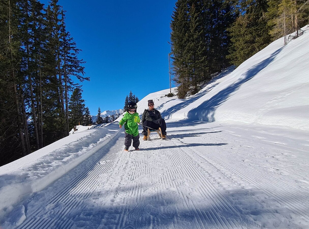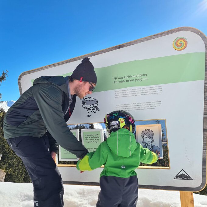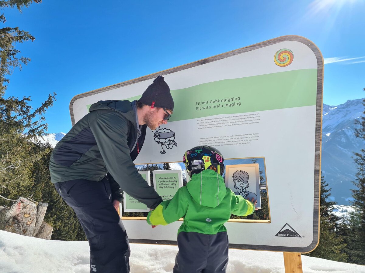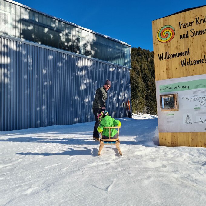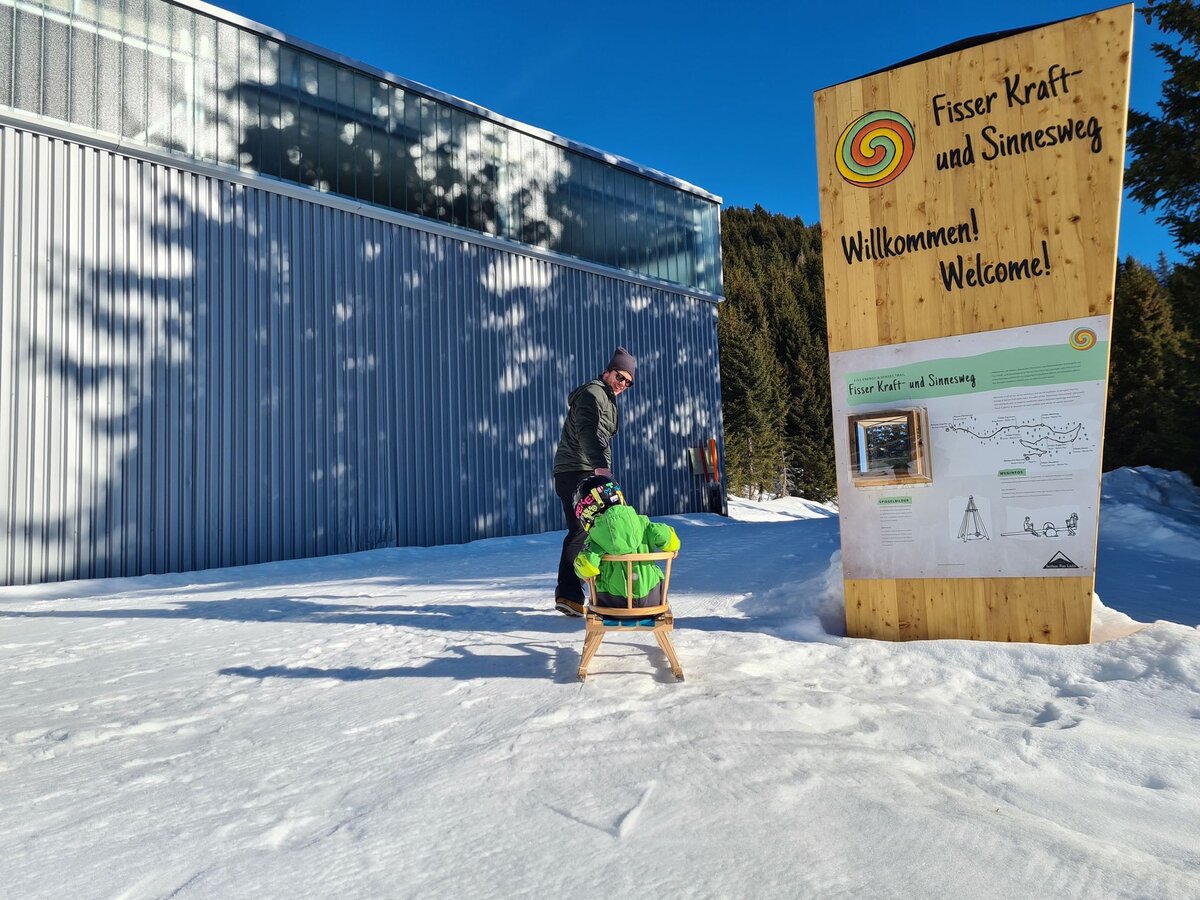 Dieser Themenweg ist sehr EMPFEHLENSWERT. Er ist breit angelegt und leicht zu erkunden, da er nur leicht abfallend ist. Damit beim Wandern auch bei größeren Kids keine Langweile aufkommt, bieten die Stationen, die den Sinnen einen Streich spielen, genügend Raum für Abenteuer. Hast du so einen kleinen Zwerg wie ich dabei? Dann nimm am besten eine Rodel mit, da besonders die kleinen Weltentdecker gerne schnell müde werden. Für Abwechslung sorgt die Möglichkeit, am Ende auf der Rodelbahn Fiss ins Tal zu gelangen. Auch im Sommer lädt der Fisser Kraft- und Sinnesweg zu einer interaktiven Familienwanderung ein und ist sogar mit Kinderwagen erlebbar. Was wohl Konstantins Lieblingsfarbe beim Wandern ist? SCHNEEWEISS oder doch WIESENGRÜN?