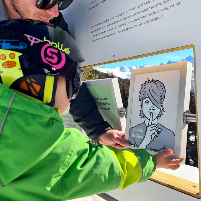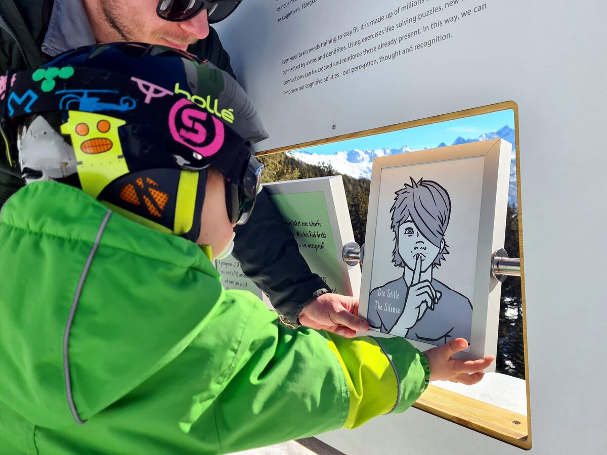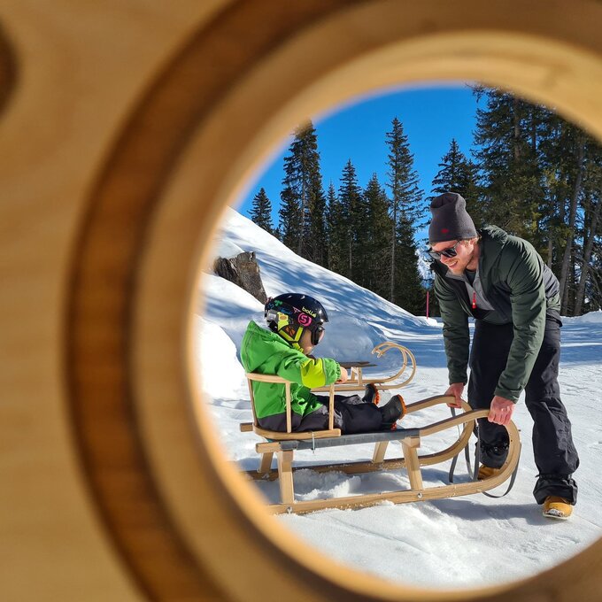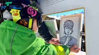 Zwischen den Rodel- und Wanderpassagen gibt es viel zu entdecken. Ein vermeintliches FERNGLAS etwa steht vor einem wunderschönen Panorama. Durch die Öffnung sehen wir allerdings keine Berge und Schneelandschaften. Neugierig "gigglat" Konstantin durch die Röhre.
