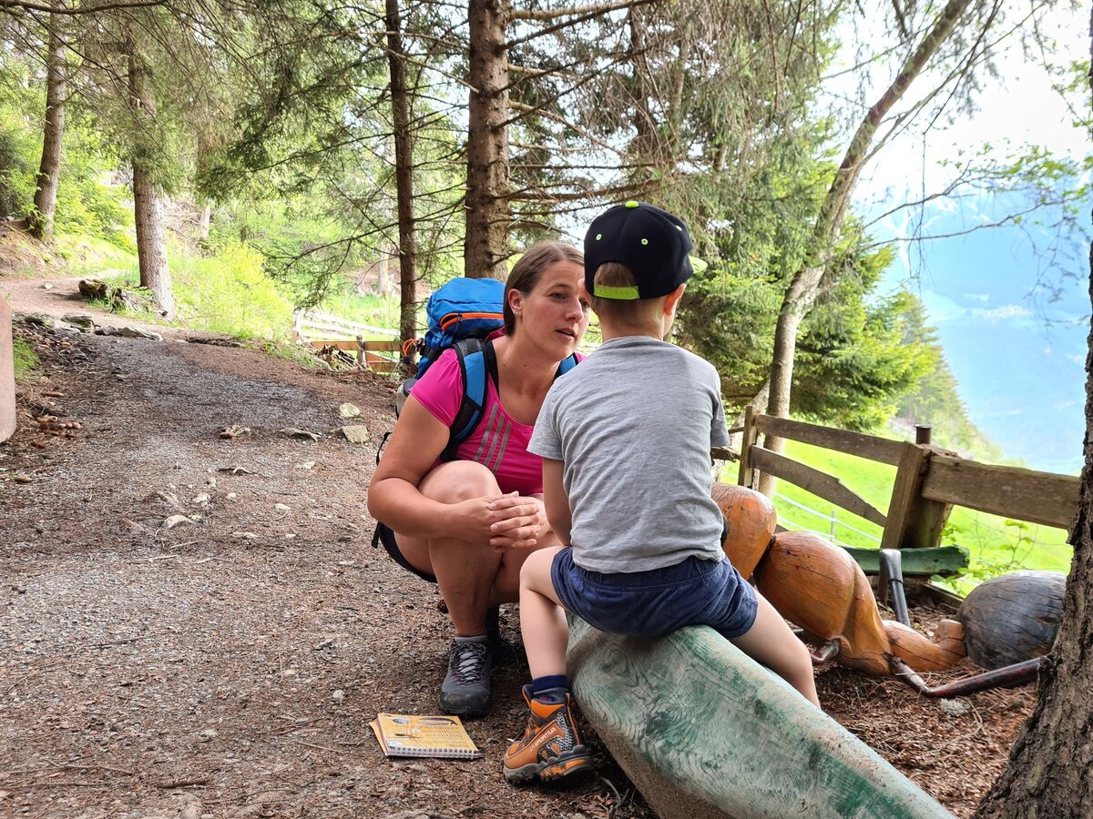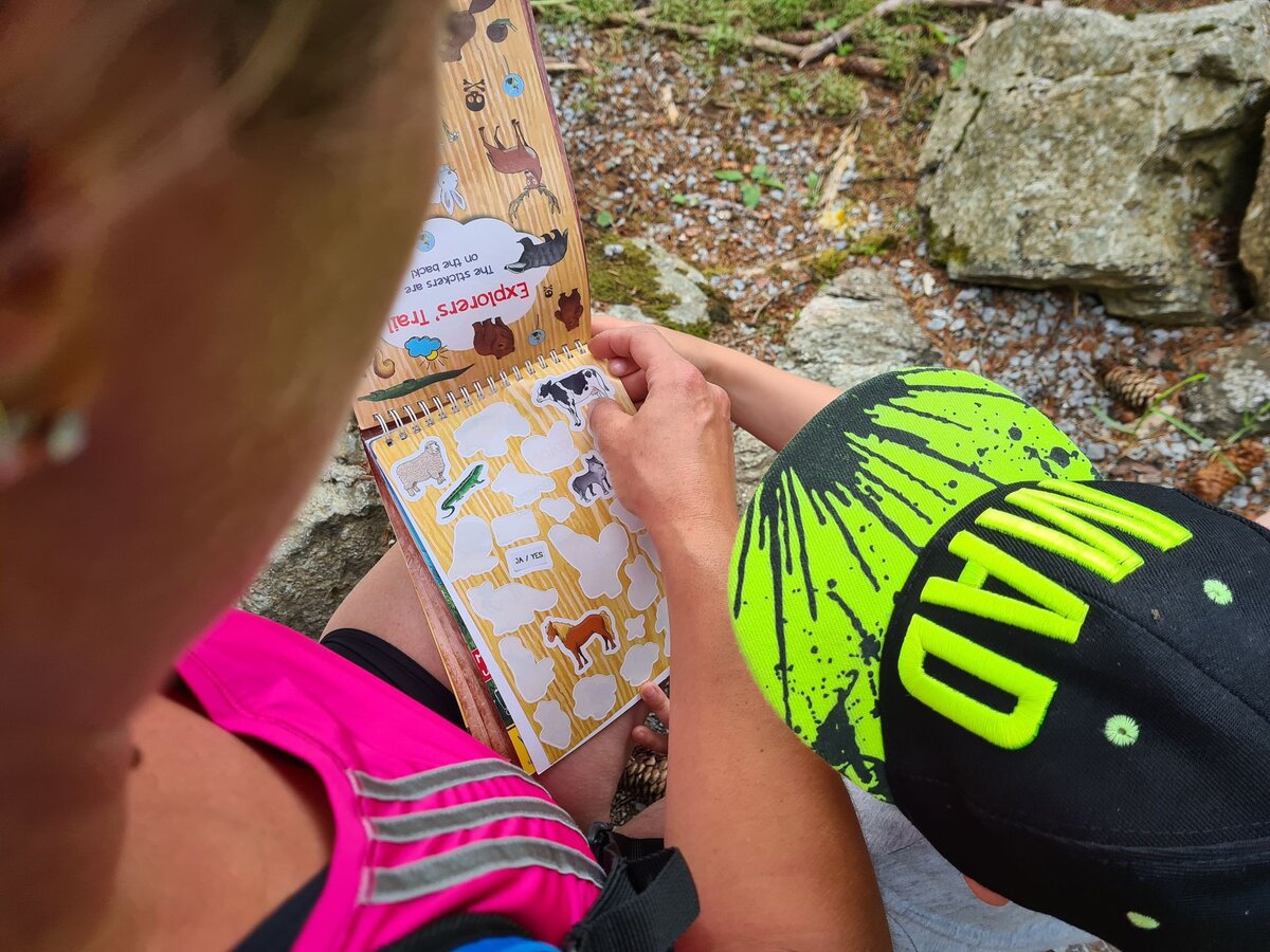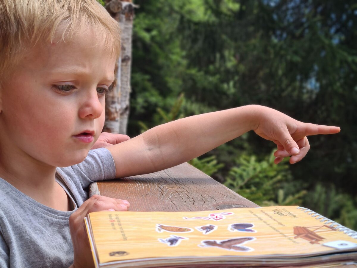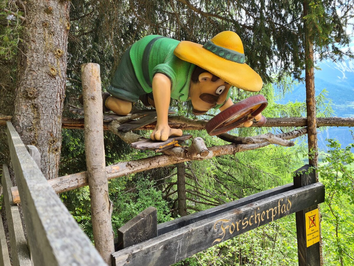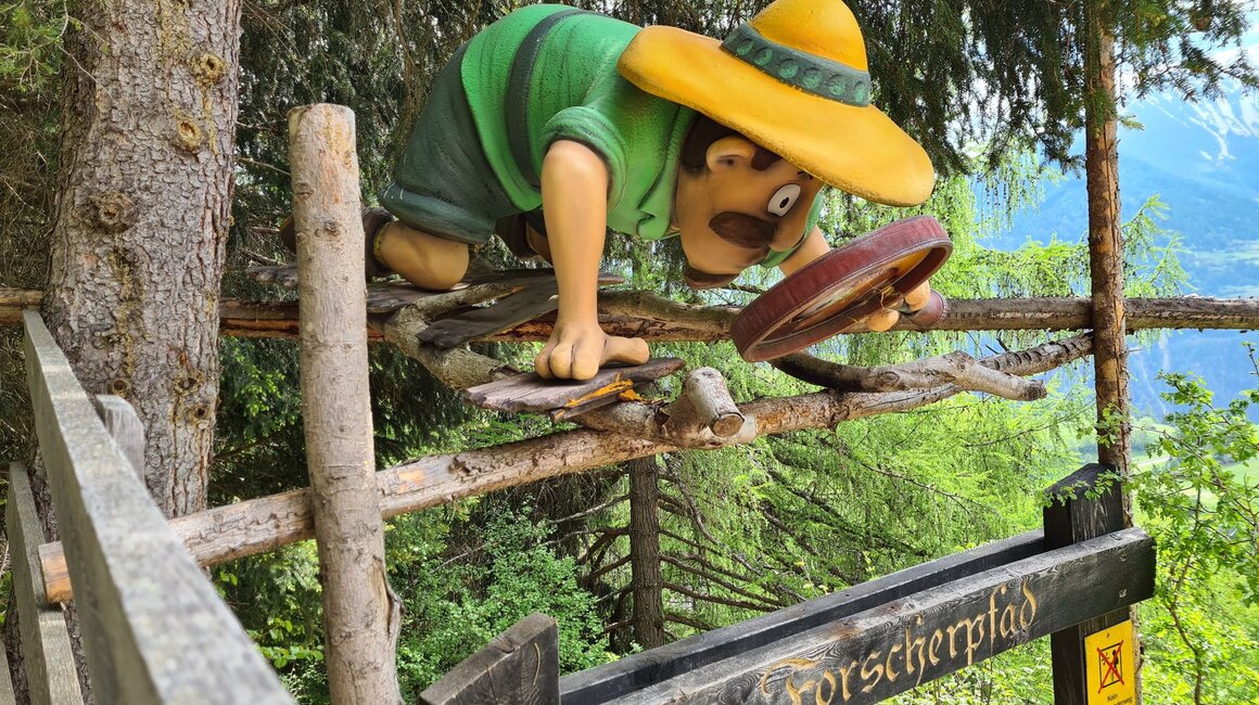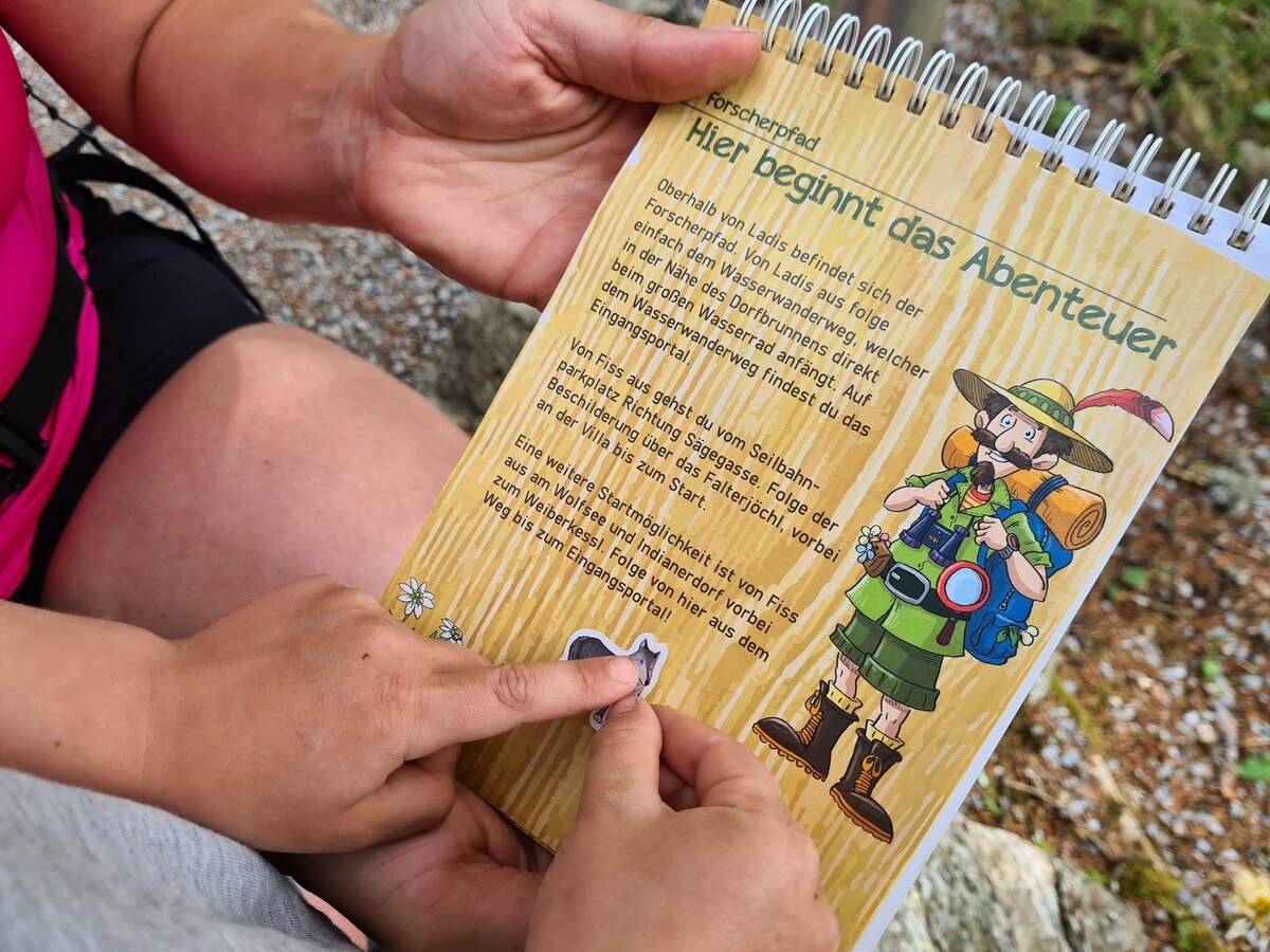Ein riesiger Forscher mit gelbem Hut beäugt uns bereits am Eingangsportal mit seiner XXL-Lupe. Nun wird es Zeit, den Rätselblock mit den bunten Stickern, den wir im Infobüro in Ladis gekauft haben, auszupacken. Hinter dem Verkauf des Rätselblocks steckt übrigens ein VERSPRECHEN an alle kleinen Abenteurer. Die 3 Euro landen nämlich in einem Topf für den GUTEN ZWECK. Mit einem guten Bauchgefühl und reichlich Neugierde in unseren zappeligen Füßen blättern wir vorbei an den Rätseln des Piraten- und Hexenweges und starten unser Abenteuer im hinteren Drittel des Stickerblocks.